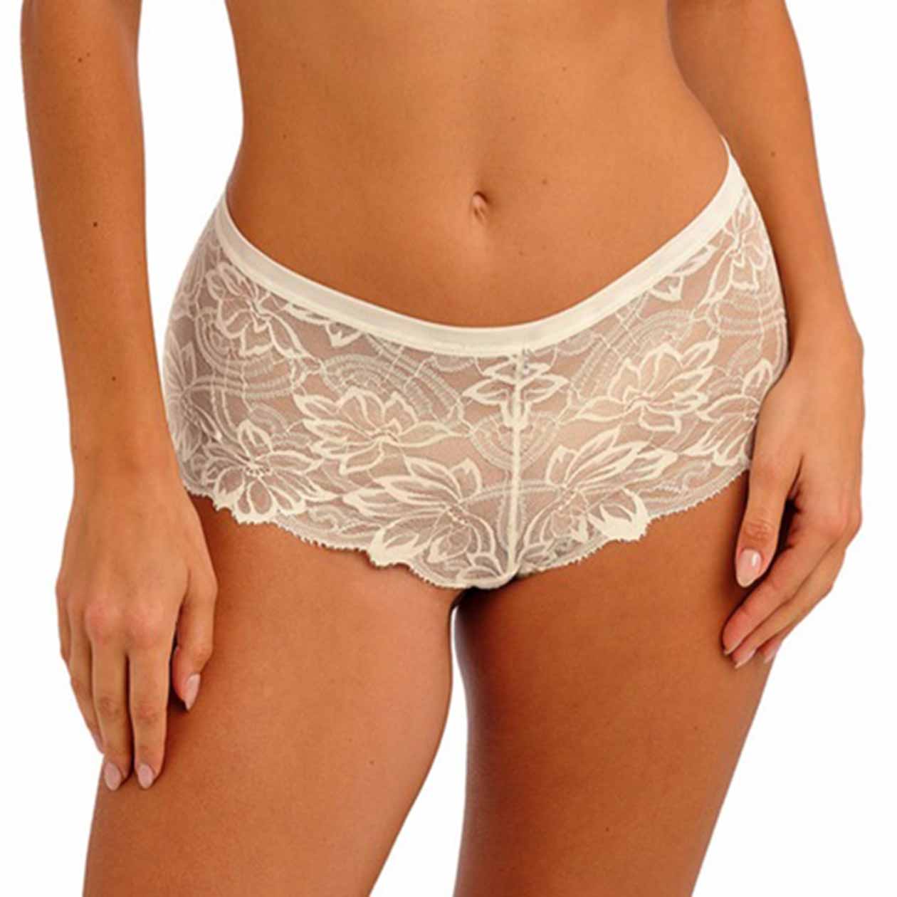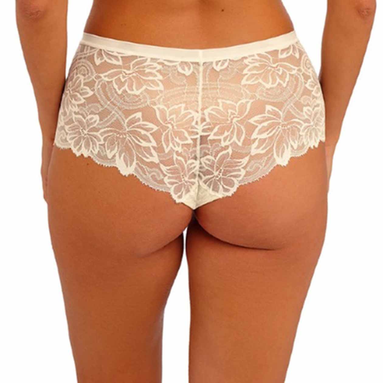 The Abellia Short is a comfortable and cheeky style with a mid-rise waist and cheeky back coverage. It's a full stretch lace short with beautiful scallop detail at the leg edges. A folded stretch mesh waistband ensures comfort, and a delicate pearl drop effect trim at the center front adds a final elegant touch.