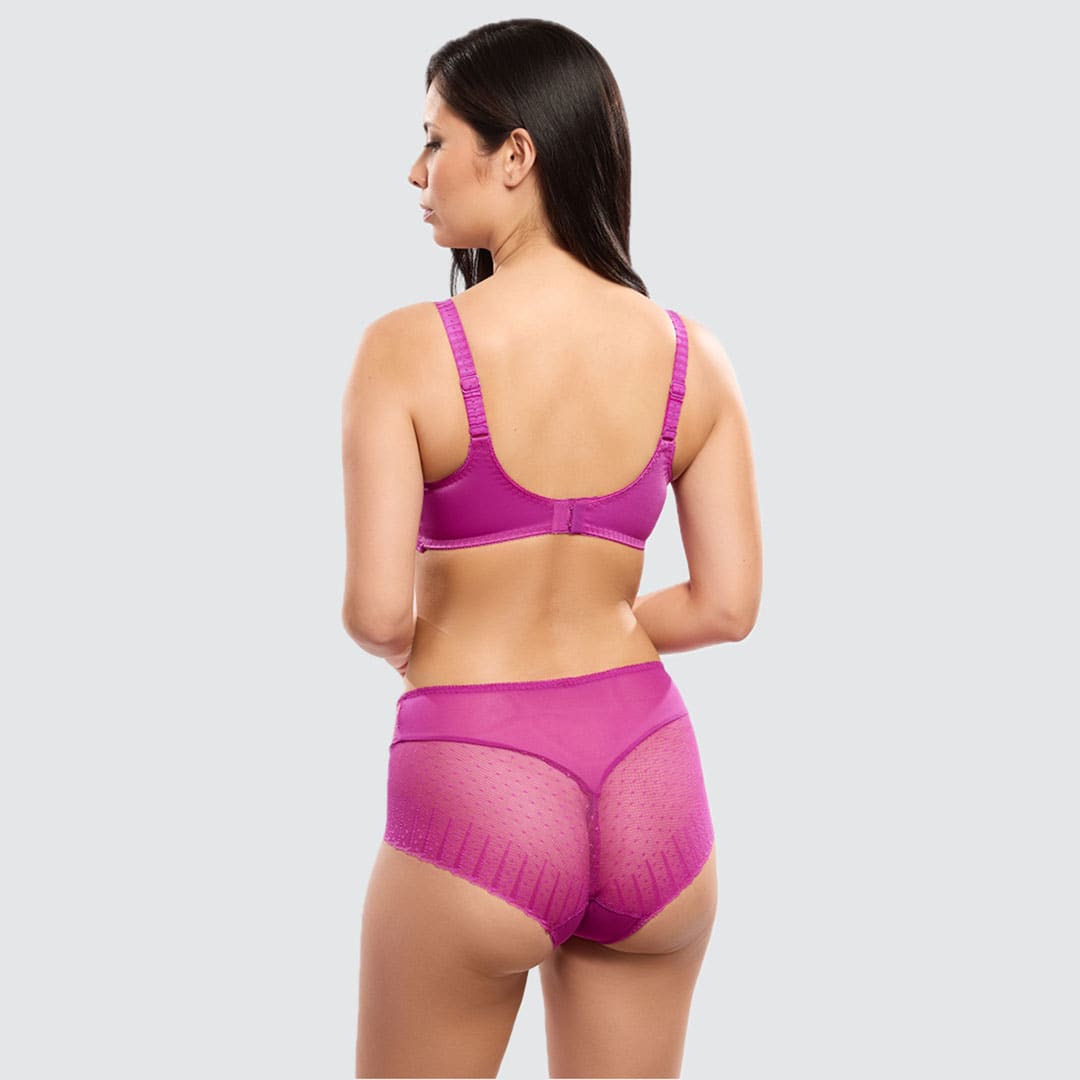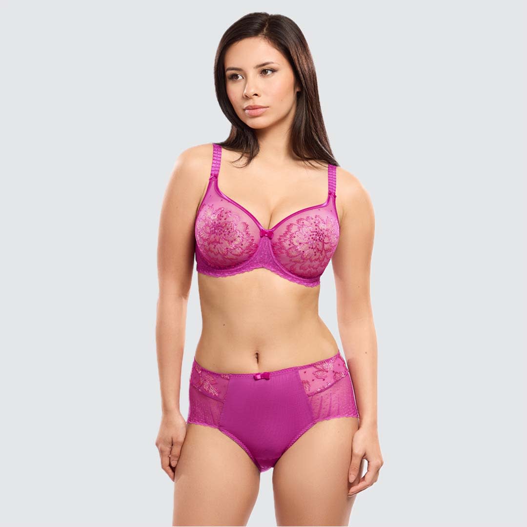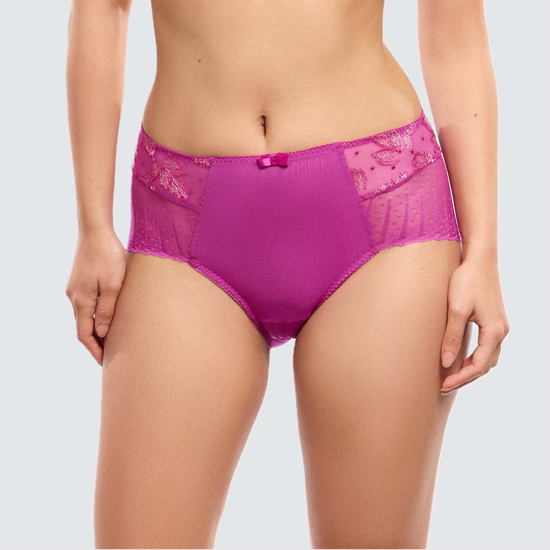 This stunning panty features exquisite floral embroidery and lace accents, with shiny threads that create shimmering reflections for a flattering, radiant look.