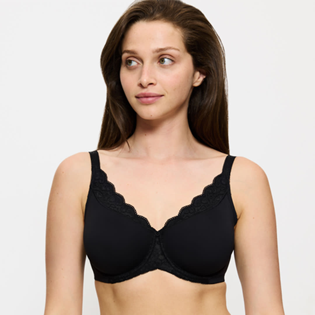 The Amourette Minimiser Bra is a wired minimiser design that visually reduces the bust by one cup size, featuring soft plain microfibre wings, new soft elastics along the inner cup edge, delicate smooth stitching, and updated V-slides for enhanced comfort and support.