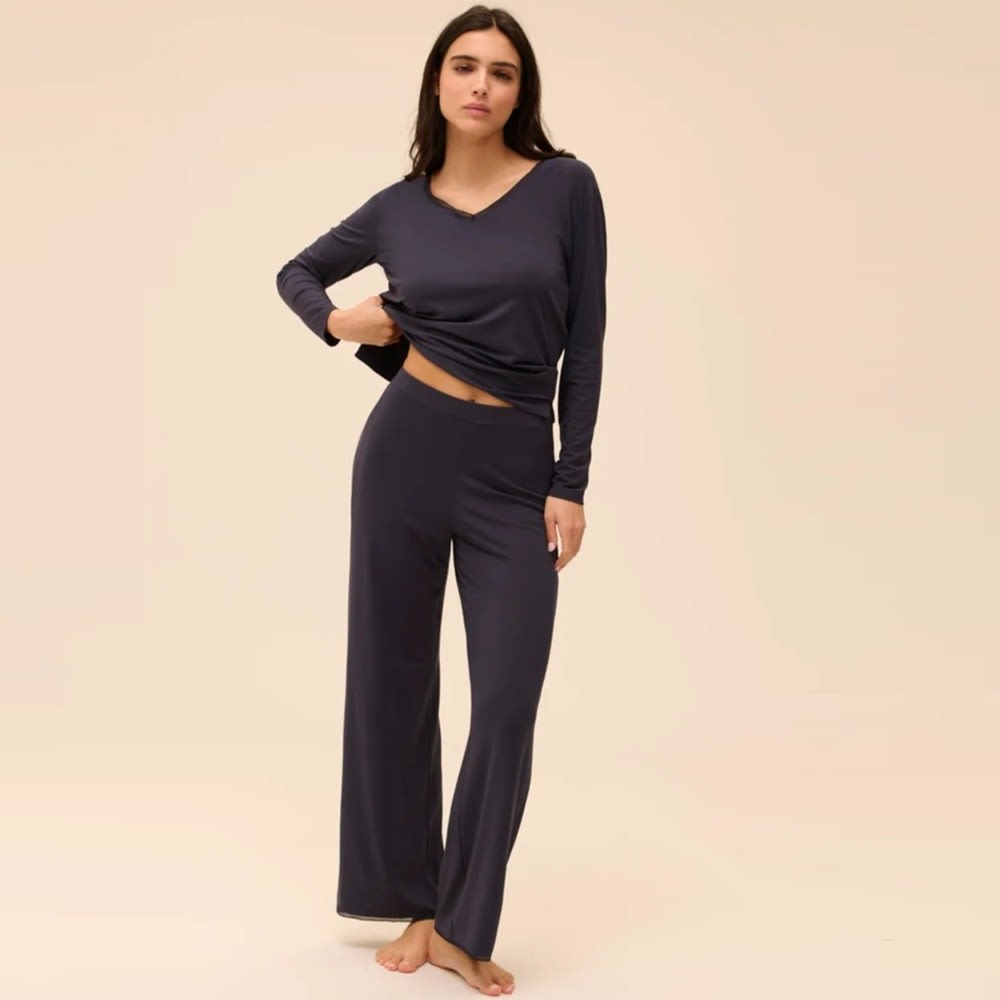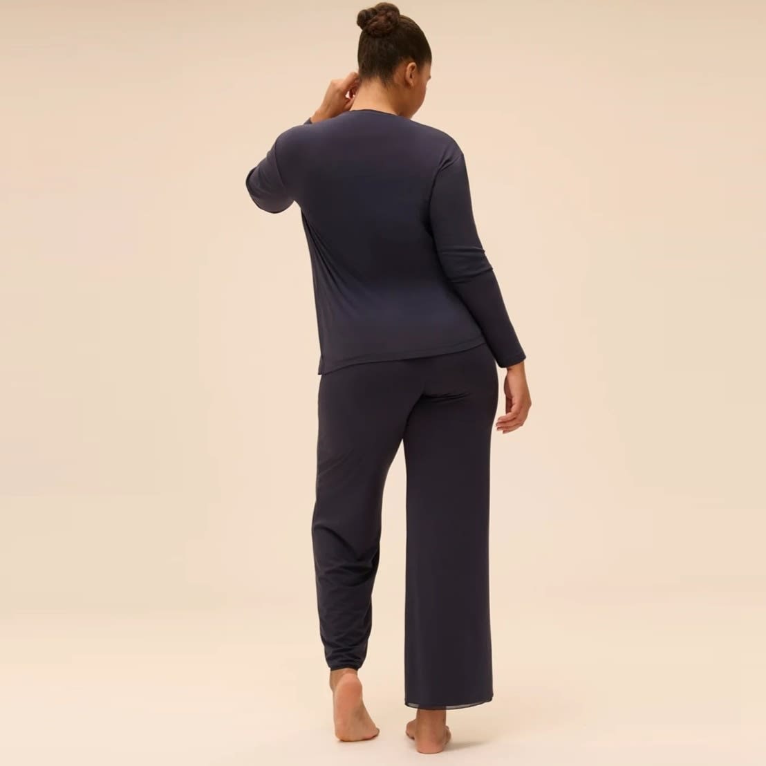 Long sleeves top in eco-friendly viscose, a flowy and ultra soft fabric. Straight cut. Neckline outlined by a thin band of lace.