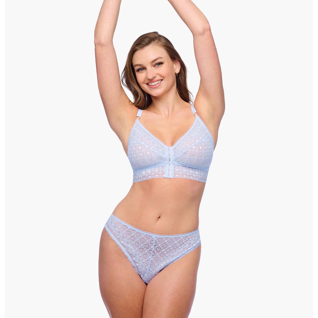 The Basilica Open Back Brief, a mid-rise bikini crafted from Italian corded lace with graphic cutouts, featuring a soft stretch lace body, elastic waistband, cotton-lined interior, and minimal rear coverage.