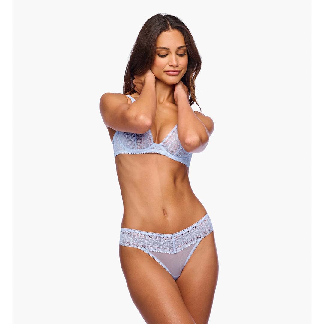 This Basilica mid-rise lace thong features a wide, soft lace waistband for a smooth, dig-free fit. With minimal rear coverage and a breathable cotton-lined interior, it offers both comfort and elegance.