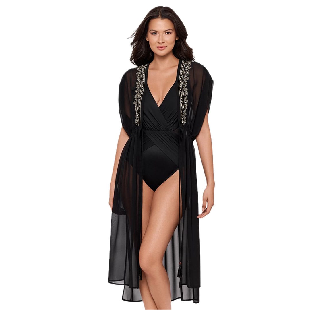 The Beach Etc Sheer Beach Cover Up Kimono features a lightweight, billowy fit with an open front, adjustable waist tie finished with wooden beads and silky tassels, and a beautifully embroidered neckline adorned with hand-sewn bead embellishments—perfect for effortless poolside or resort glamour.