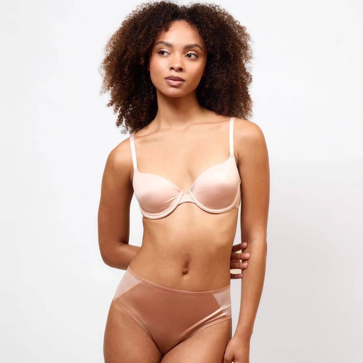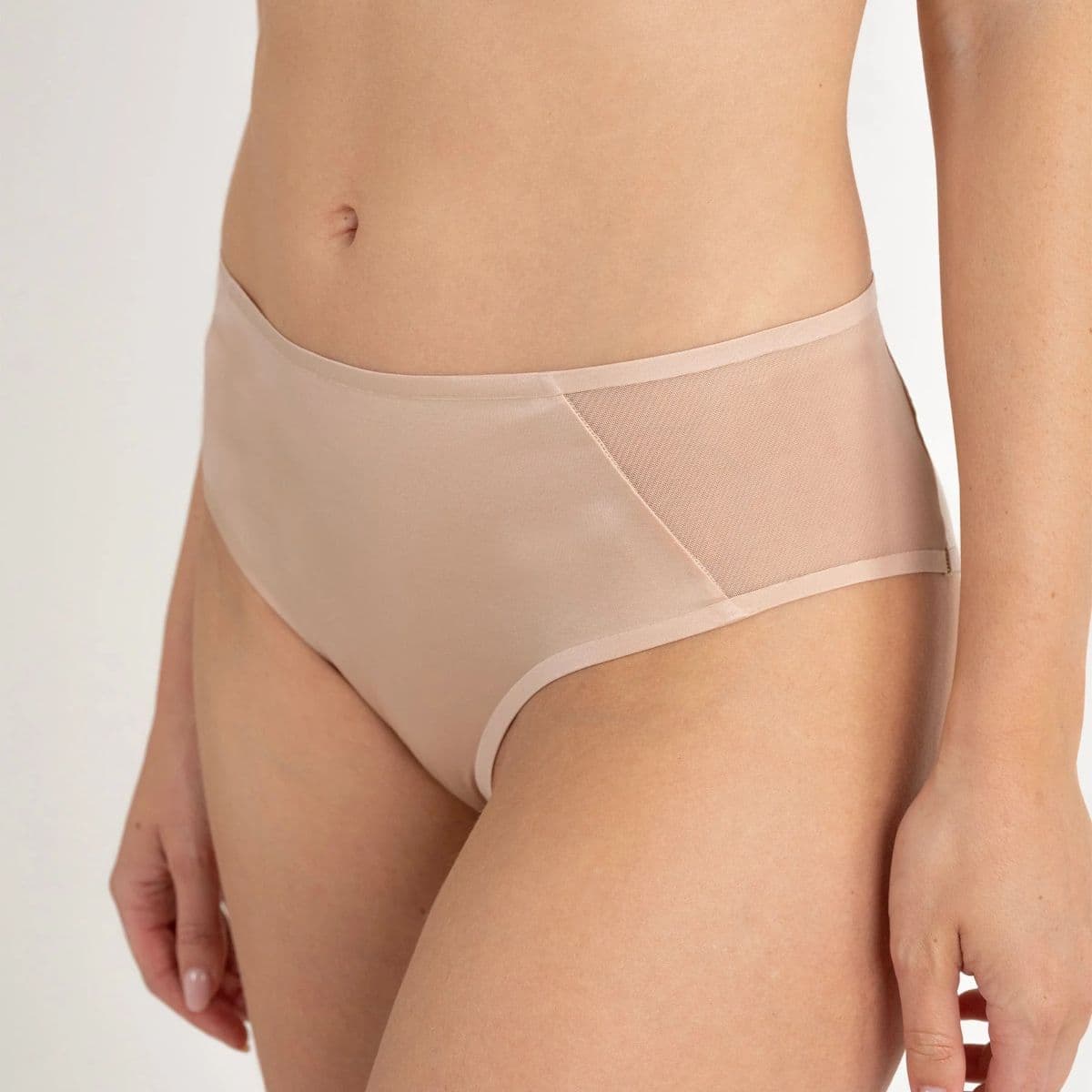 High waist brief. Ultra-soft, shiny microfibre fabric. Sheer tulle sides. Breathable, cotton-lined gusset.