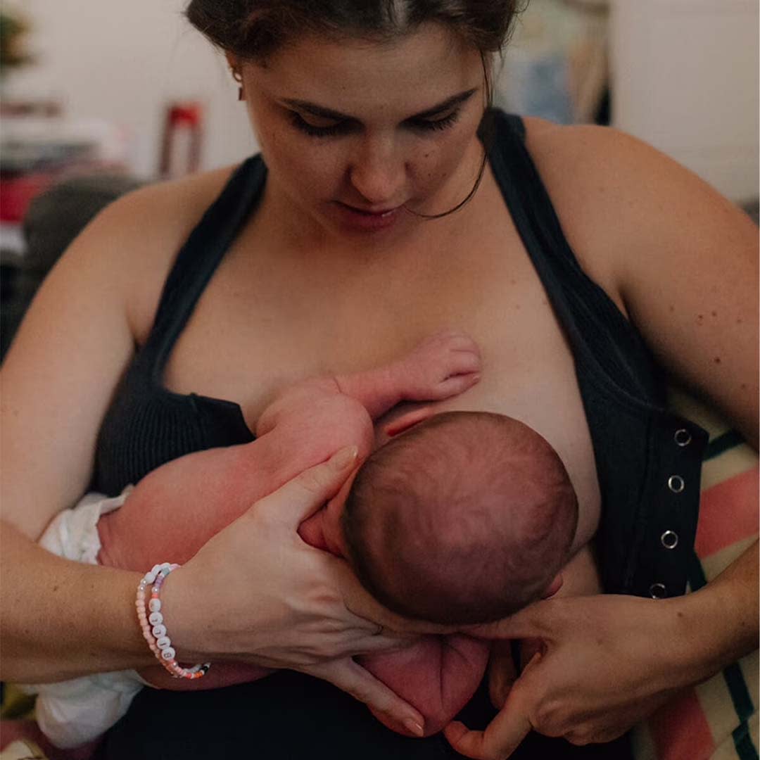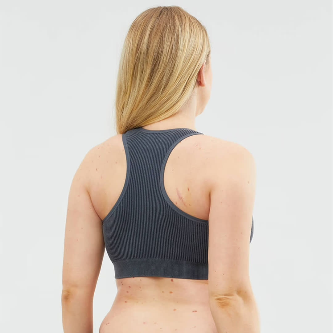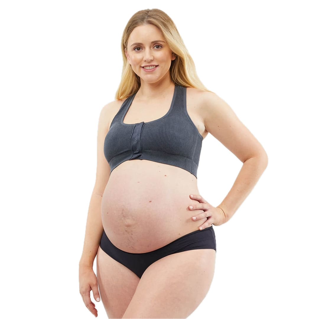 The birthing & beyond Biscotti Skin To Skin Nursing Bra is the hospital bag essential that does it all. Made from super-soft recycled yarn in a beautiful stone wash, the front opens completely for skin-to-skin time with your new bub. Plus this leakproof nursing bra is moisture wicking to keep you comfy and dry all day long!