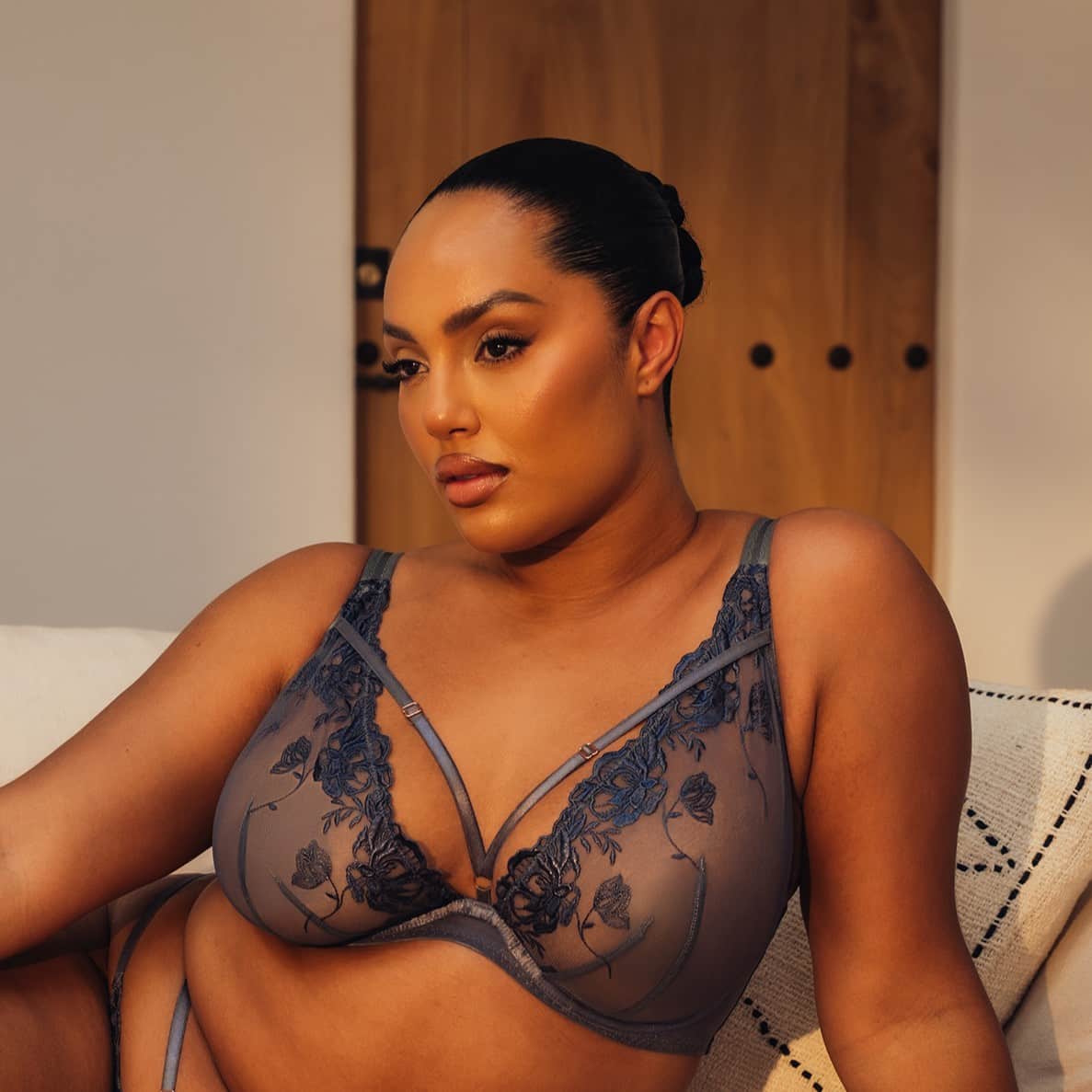 Ultra low plunge cups give great shape with less coverage. Underwired, non- padded sheer cups. Floral embroidery. High shine embroidery for striking look.