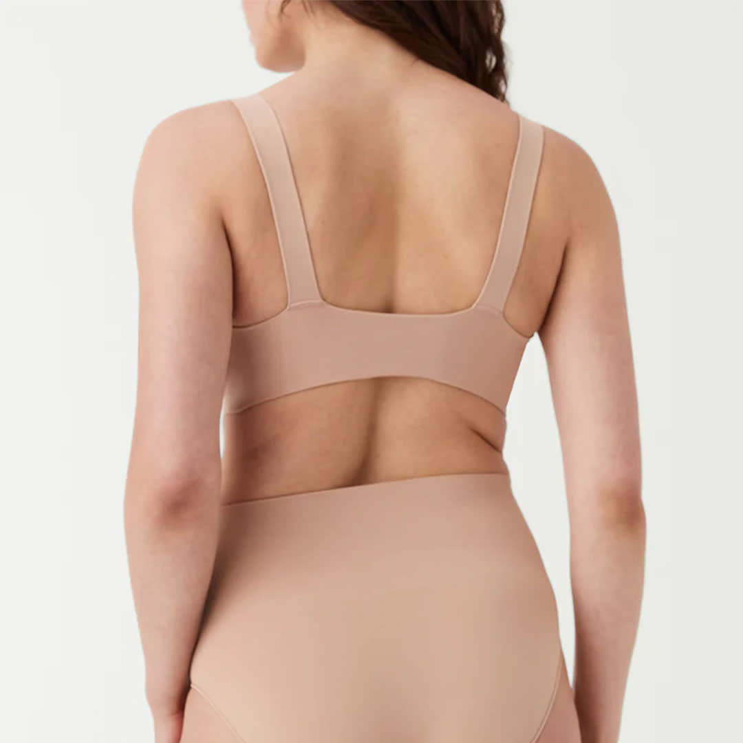 Bra-llelujah Lightly Lined Bra, featuring a convenient pull-on design with no clasps or hooks, is all about comfort. The SPANX Smart Straps® are soft, dig-free, and stay securely in place, while the patented all-hosiery back offers a smooth, seamless finish that gently streamlines your silhouette. Lightly lined cups provide soft shaping and support, and with no wires, hardware, or elastic, you’ll enjoy an irritation-free fit all day long.