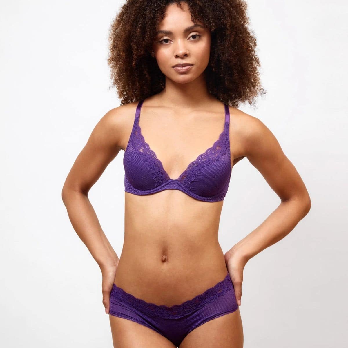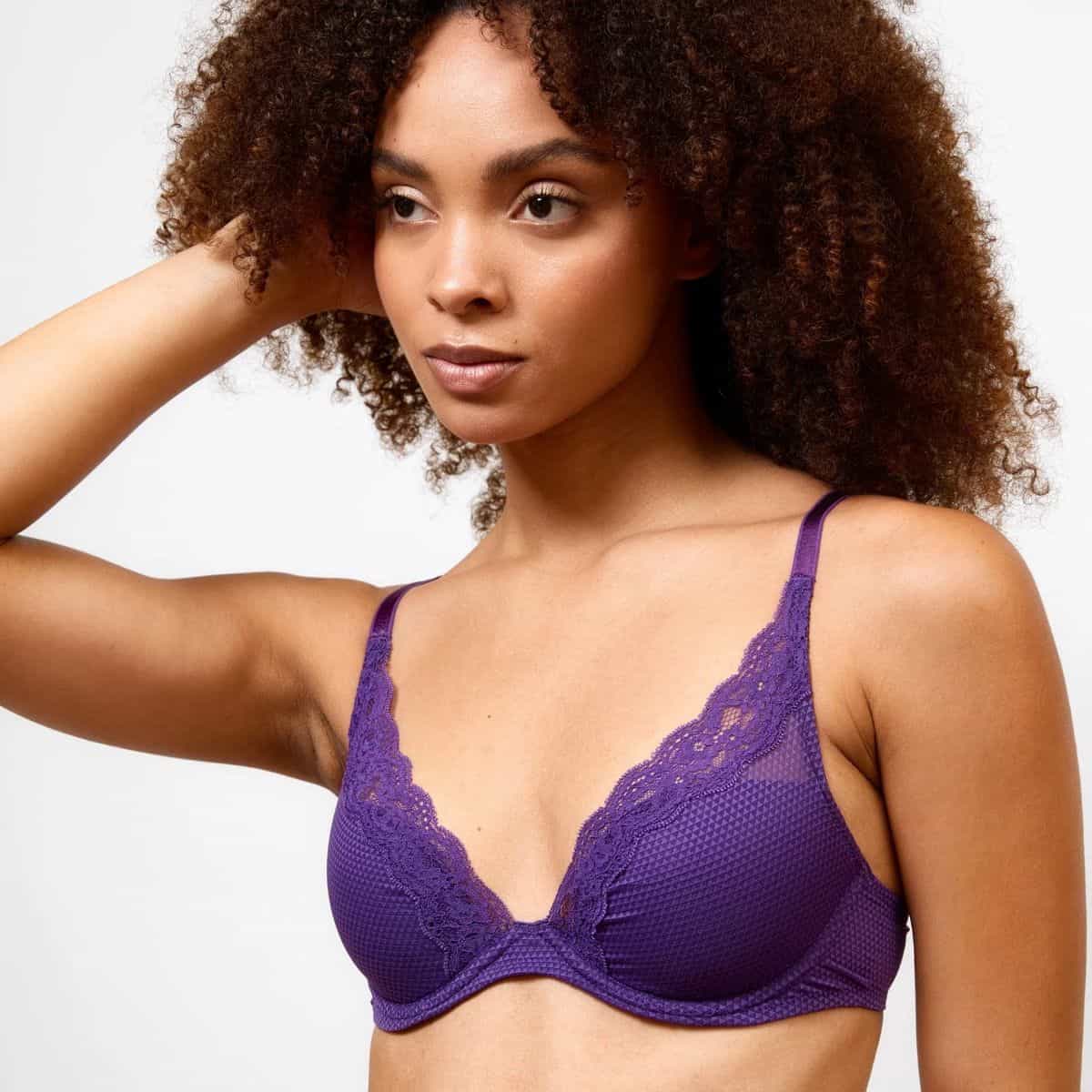 A feminine bra, easy to wear every day, which reveals a plunging and sensual neckline. Wired, high-apex cups. Sheer band in geometric-patterned tulle. Lace-trimmed neckline.
