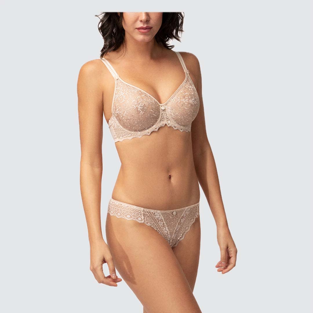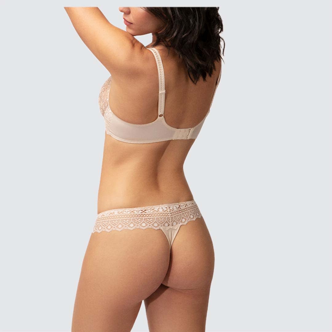 Cassiopée thong lingerie. Lace creates a strong visual impact as a trim on the thighs and sides, whilst the cut-outs make the thighs appear more slender. A simple piece where pretty lace takes centre stage both front and back.