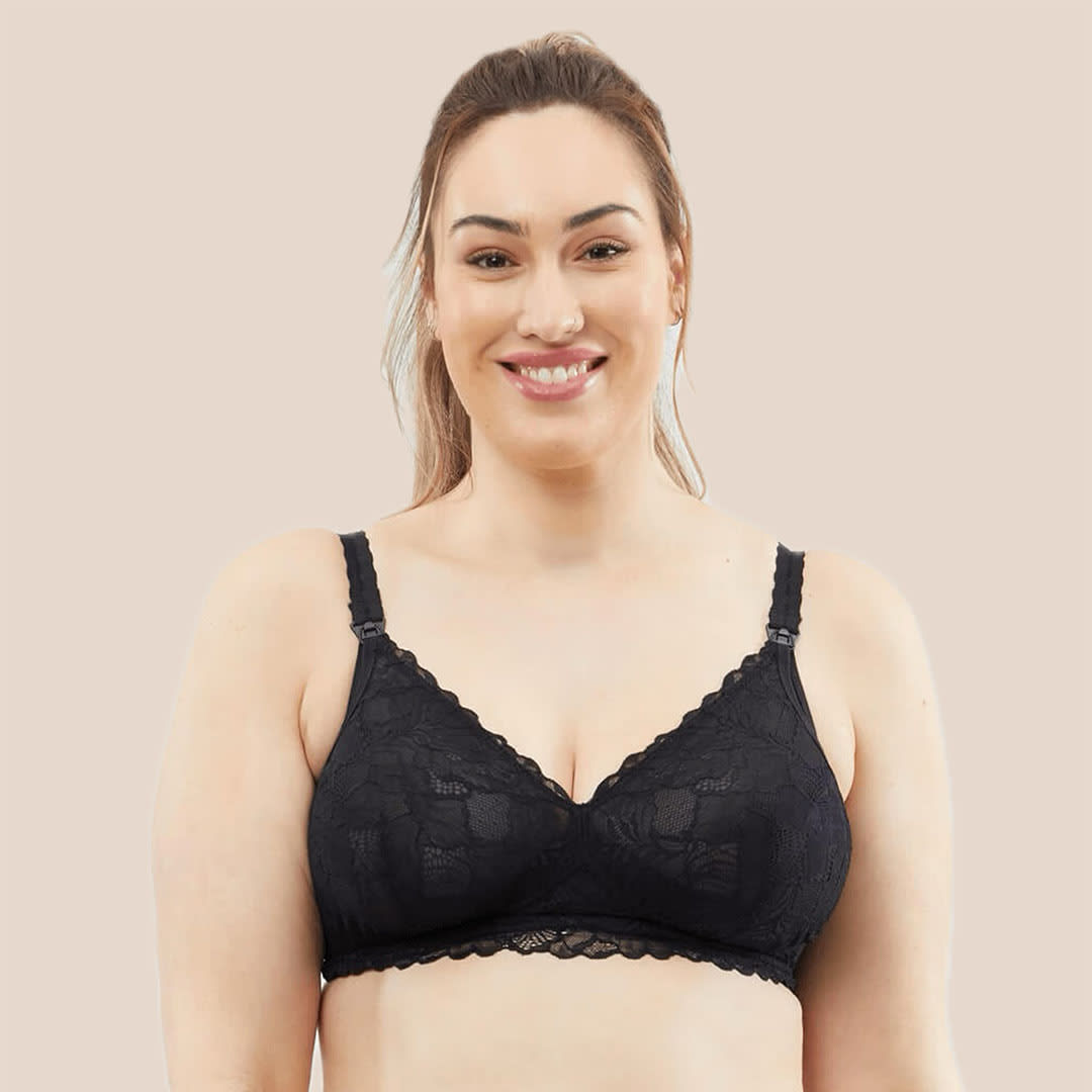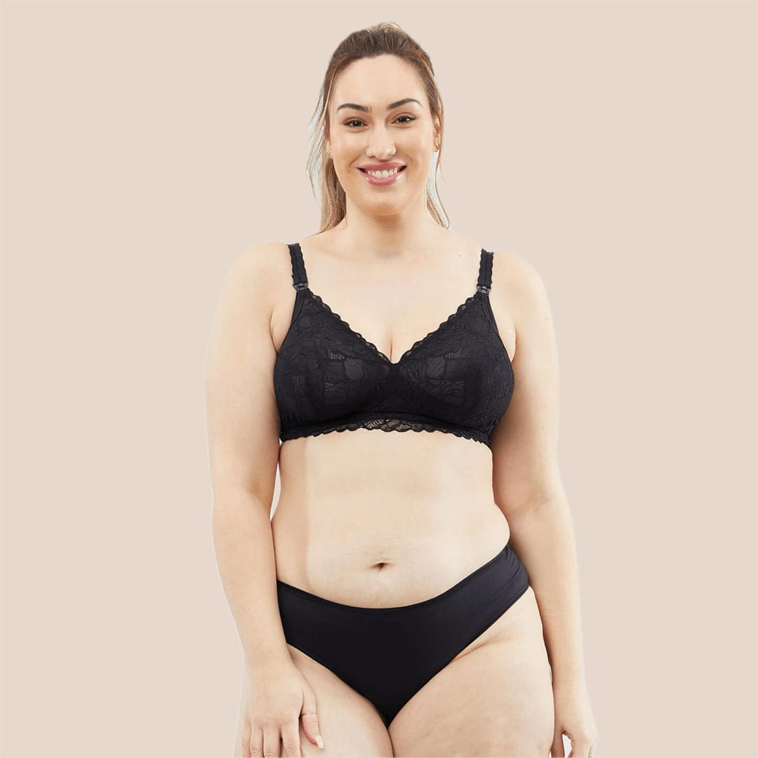 A wire-free Chantilly D-F Maternity & Nursing Bralette featuring soft French-inspired lace, easy drop-down cups, and flexible, supportive design for comfort and growth during motherhood.