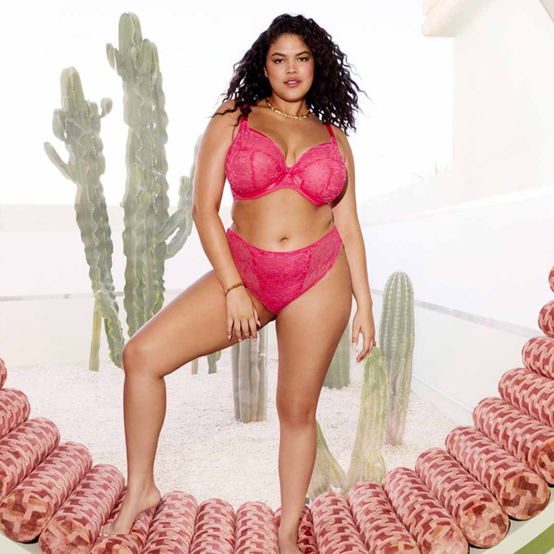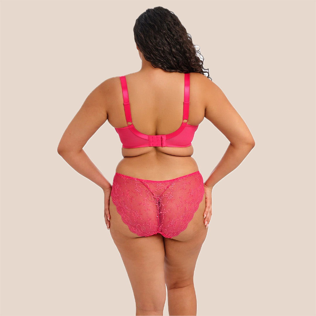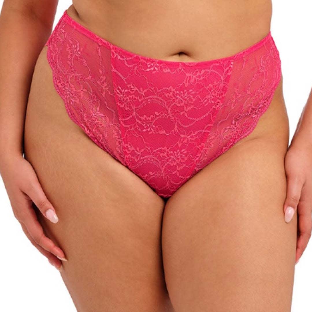 A high-leg lace Darcie Brazilian Brief featuring delicate three-tone stretch lace, a modesty-lined front, and smooth, elastic-free edges for a flattering and comfortable fit.