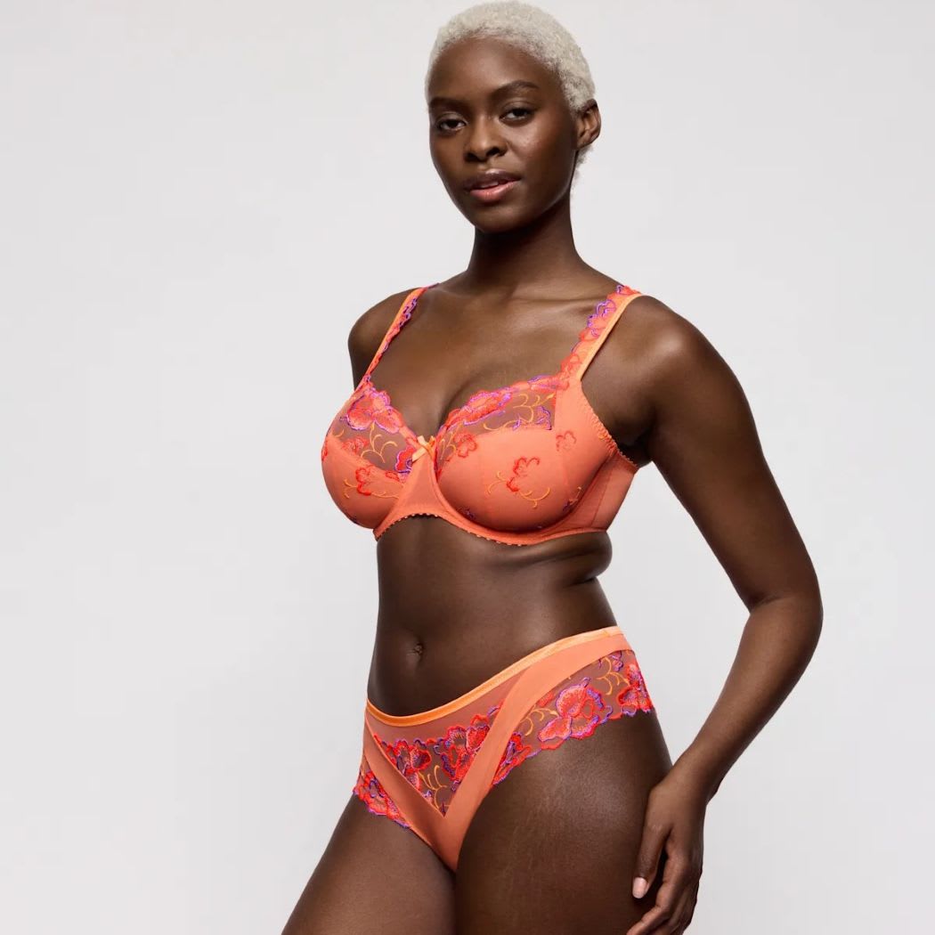 A sexy and comfortable full cup bra with colorful all-over embroidery that continues onto the straps. The contrasting trim adds the finishing touch.