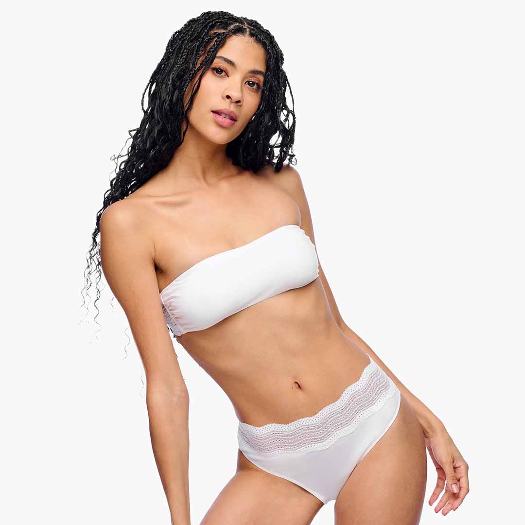A Dolce Bandeau Bra is a wireless bandeau bra crafted from ultra-soft cotton and delicate chevron lace. Designed with non-padded, smooth cotton cups for natural comfort, and a pull-on style featuring a lace back. Silicone grips at the top and bottom prevent slipping, while side boning provides extra support. For best care, hand wash in cold water and avoid tumble drying.