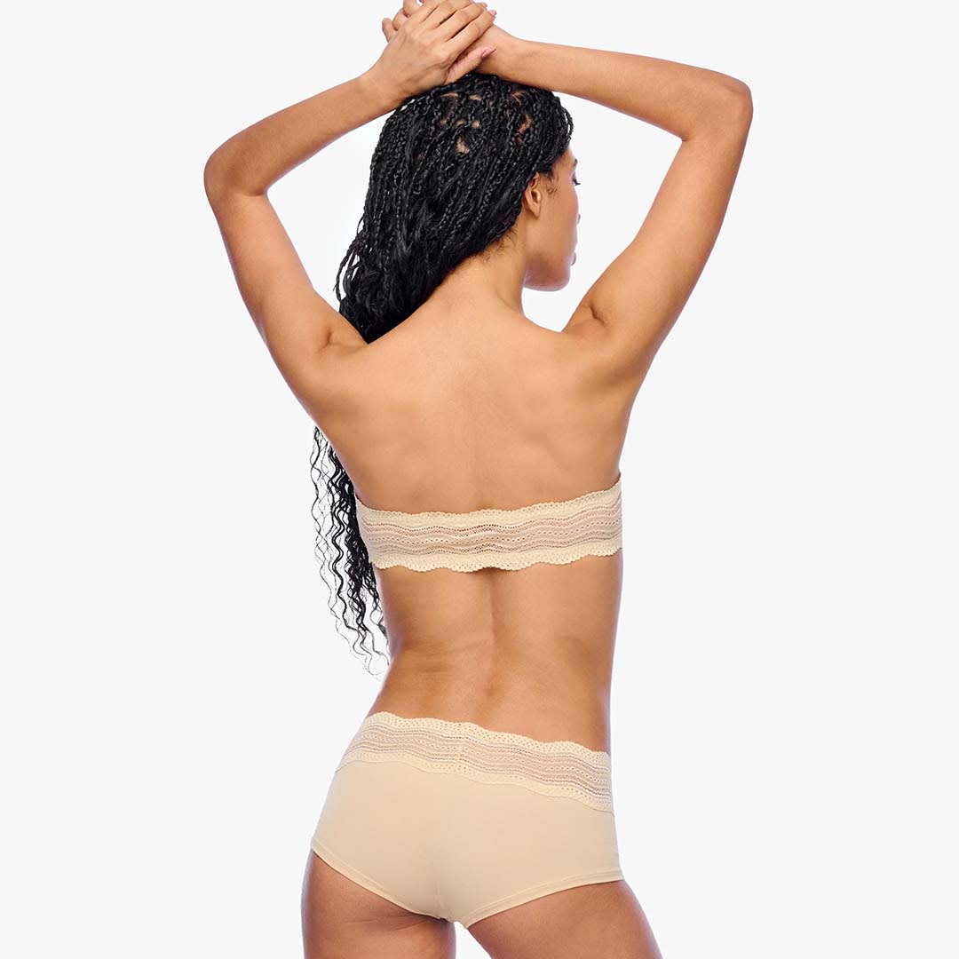 A Dolce Bandeau Bra is a wireless bandeau bra crafted from ultra-soft cotton and delicate chevron lace. Designed with non-padded, smooth cotton cups for natural comfort, and a pull-on style featuring a lace back. Silicone grips at the top and bottom prevent slipping, while side boning provides extra support. For best care, hand wash in cold water and avoid tumble drying.