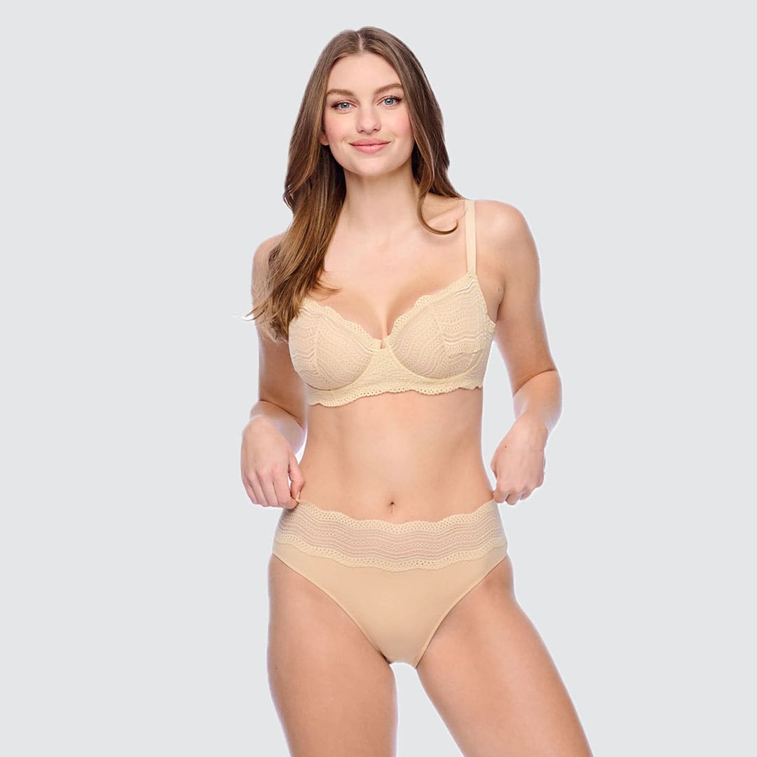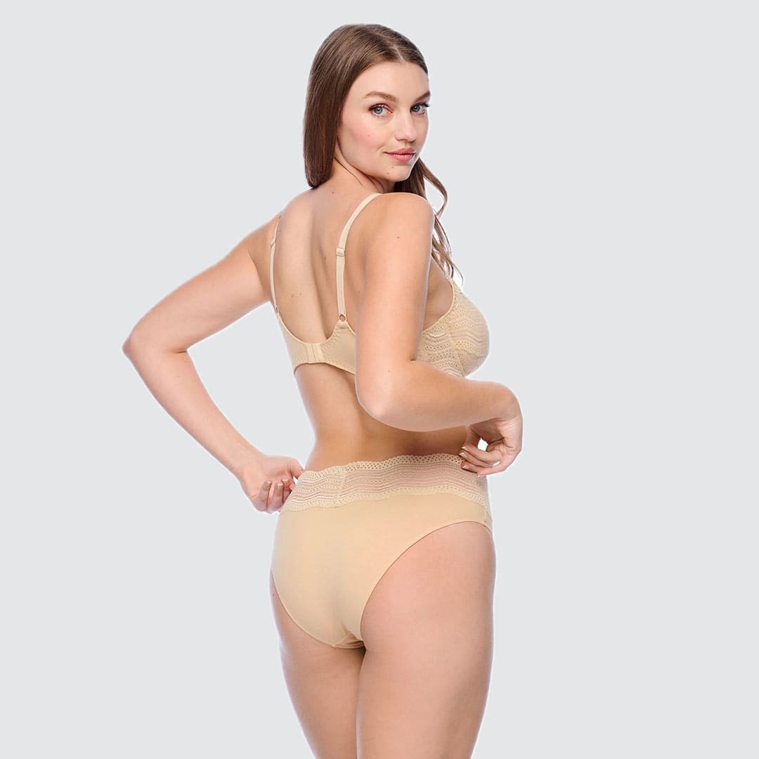 High-rise Dolce bikini crafted from a soft cotton blend with delicate chevron lace. Features a wide, stretchy lace waistband that sits at the belly button for a flattering fit, offering full rear coverage. Finished with a cotton-lined gusset for comfort. Machine wash on a delicate cycle; do not tumble dry.