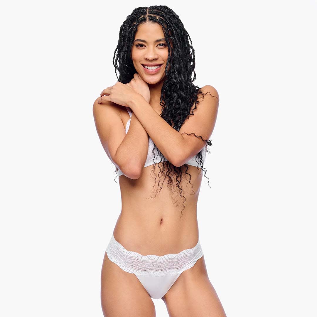 Ultra-soft cotton blend Dolce Thong featuring a stretchy semi-sheer chevron lace waistband, mid-rise thong design with minimal rear coverage, and a cotton-lined gusset for comfort.