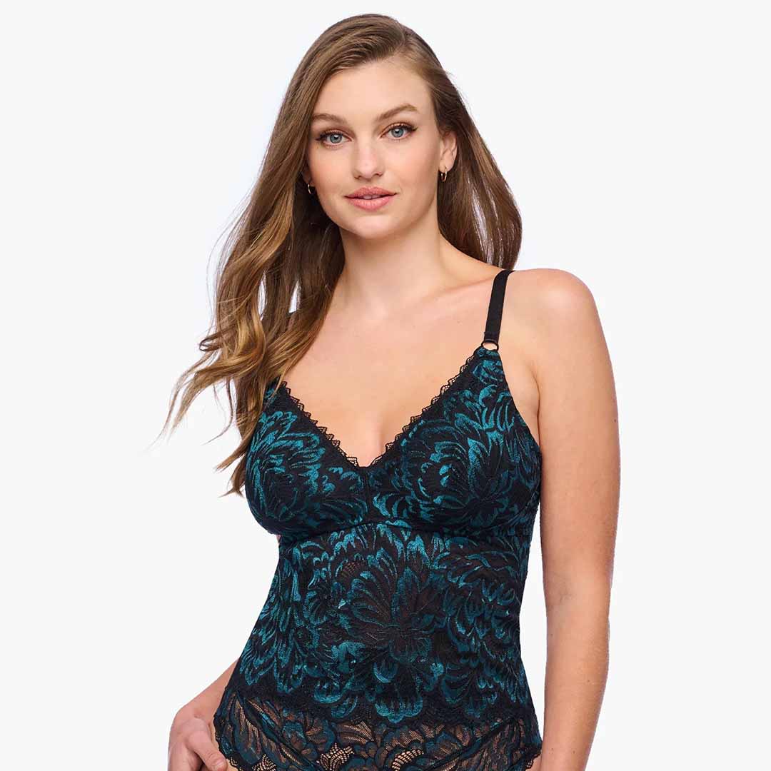 Encantata Curvy Camisole is a wireless camisole crafted from two-tone Italian lace, designed specifically for smaller bands and fuller cups. Features a hidden power mesh lining and elastic underband for gentle support and structure. Finished with wide, adjustable straps for all-day comfort. Hand wash only; do not tumble dry.
