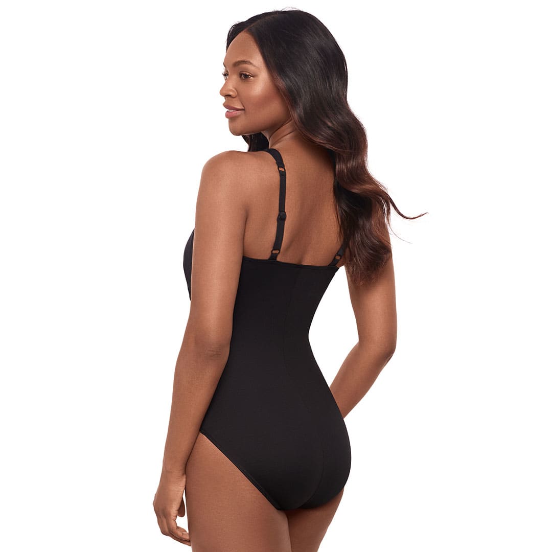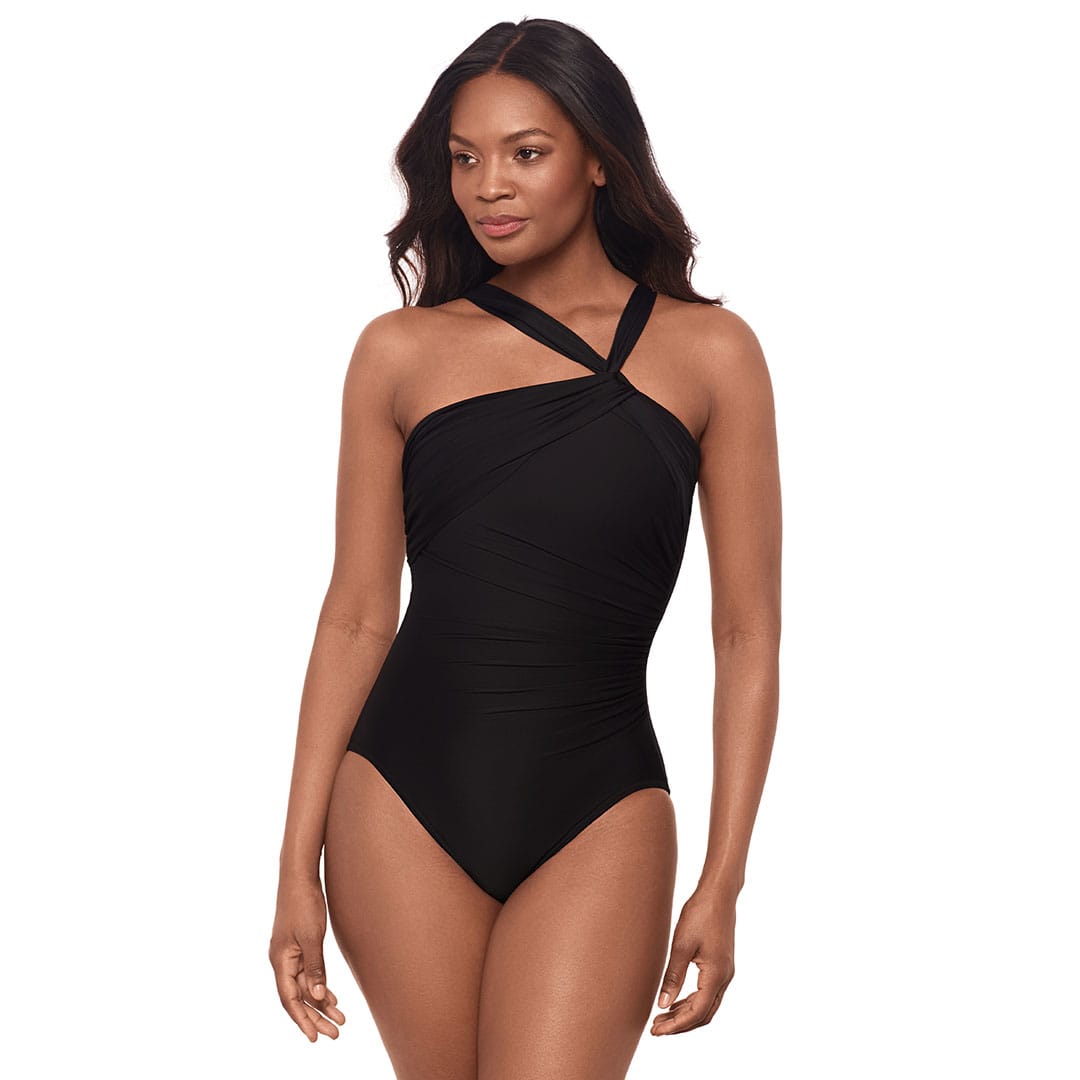 The Europa Asymmetric Underwire Shaping Swimsuit designed to make you look 10 lbs lighter in 10 seconds®, featuring hidden underwire support, a modern twist-knot detail, figure-flattering draped fabric, and padded adjustable shoulder straps.