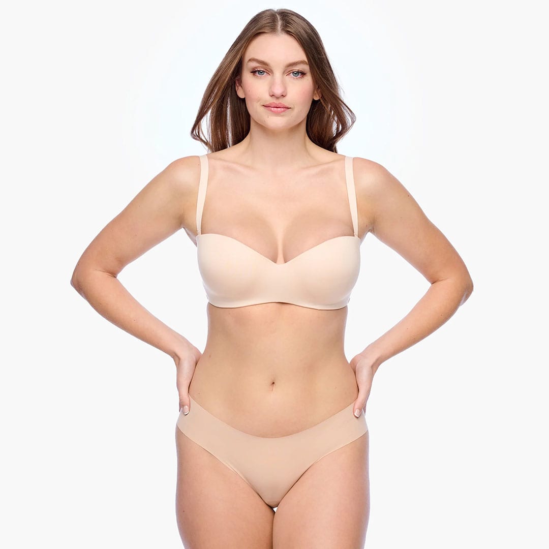 The Evolution Strapless Bra features a smooth molded microfiber finish for a flawless silhouette, silicone elastics for secure support, removable adjustable straps for versatility, and a classic hook-and-eye back closure for confident, all-day wear.