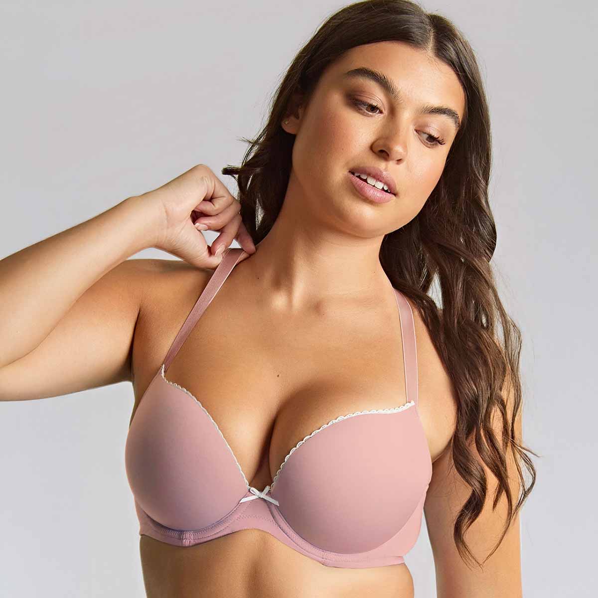 Featuring a beautifully smooth, semi-sheen microfibre, mesh detailing along the wings, and silver trim for a modern and sleek finish. Faith Moulded Plunge Bra offers a smooth silhouette under clothes, with soft recycled microfibre. Lower sitting wires for less coverage and more cleavage, creating the perfect plunging shape. The high back apex and back scoop provide smoothing coverage and a firm and comfortable fit around the body. The perfect everyday essential.