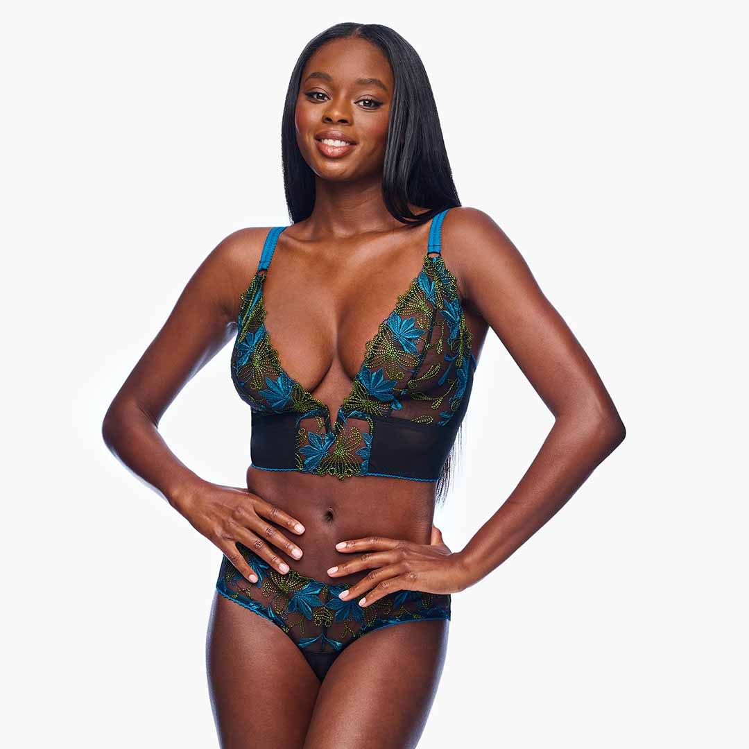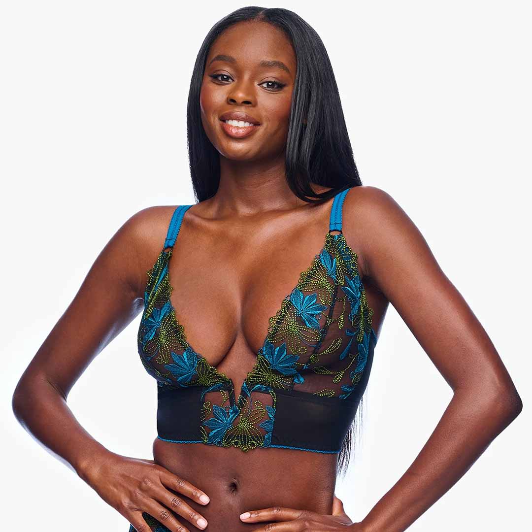 This wireless Fiorita Curvy Longline Bralette features a V-wire plunge neckline that offers gentle support while enhancing natural shape. Designed for smaller bands and fuller cups, it combines custom French embroidery with soft stretch mesh for a luxurious feel. Finished with wide, adjustable straps and an elastic underband for added comfort and a secure fit. Hand wash only and avoid machine drying to maintain its delicate craftsmanship.