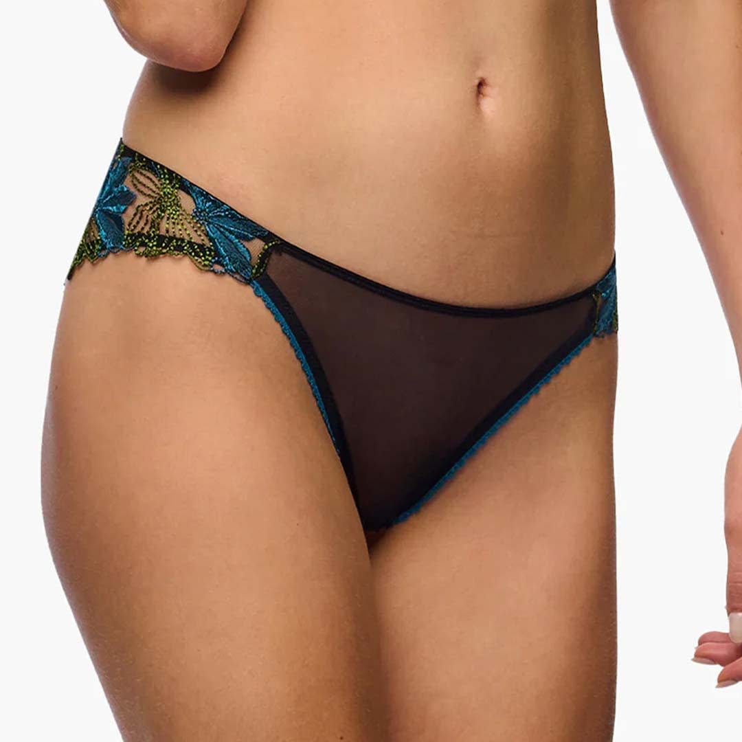 The Fiorita Naughty Bikini Brief is a mid-rise, open-back bikini style crafted from custom French embroidery and mesh with a soft waistband and cotton-lined comfort.