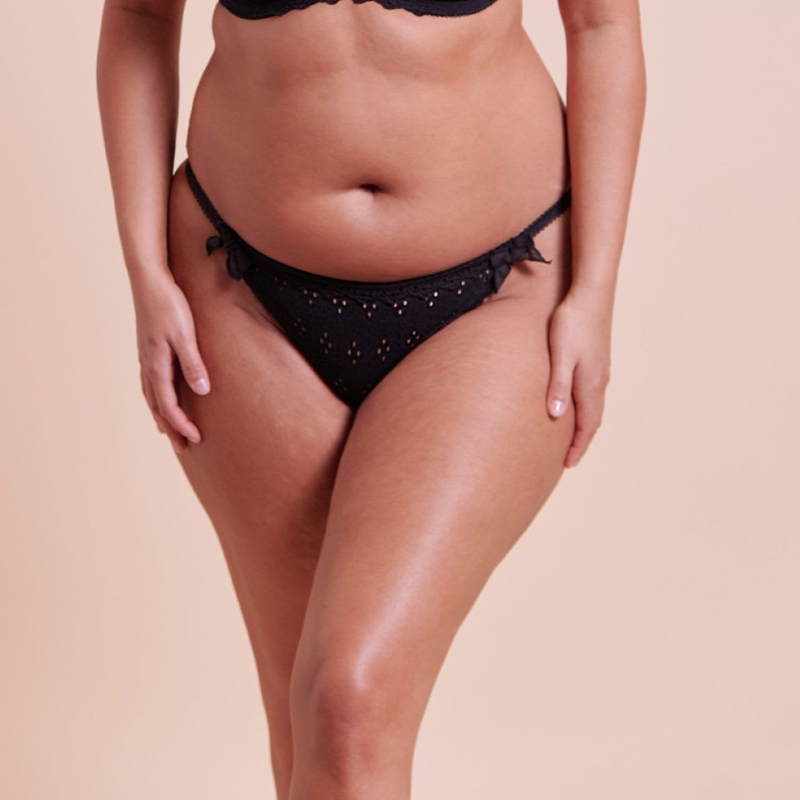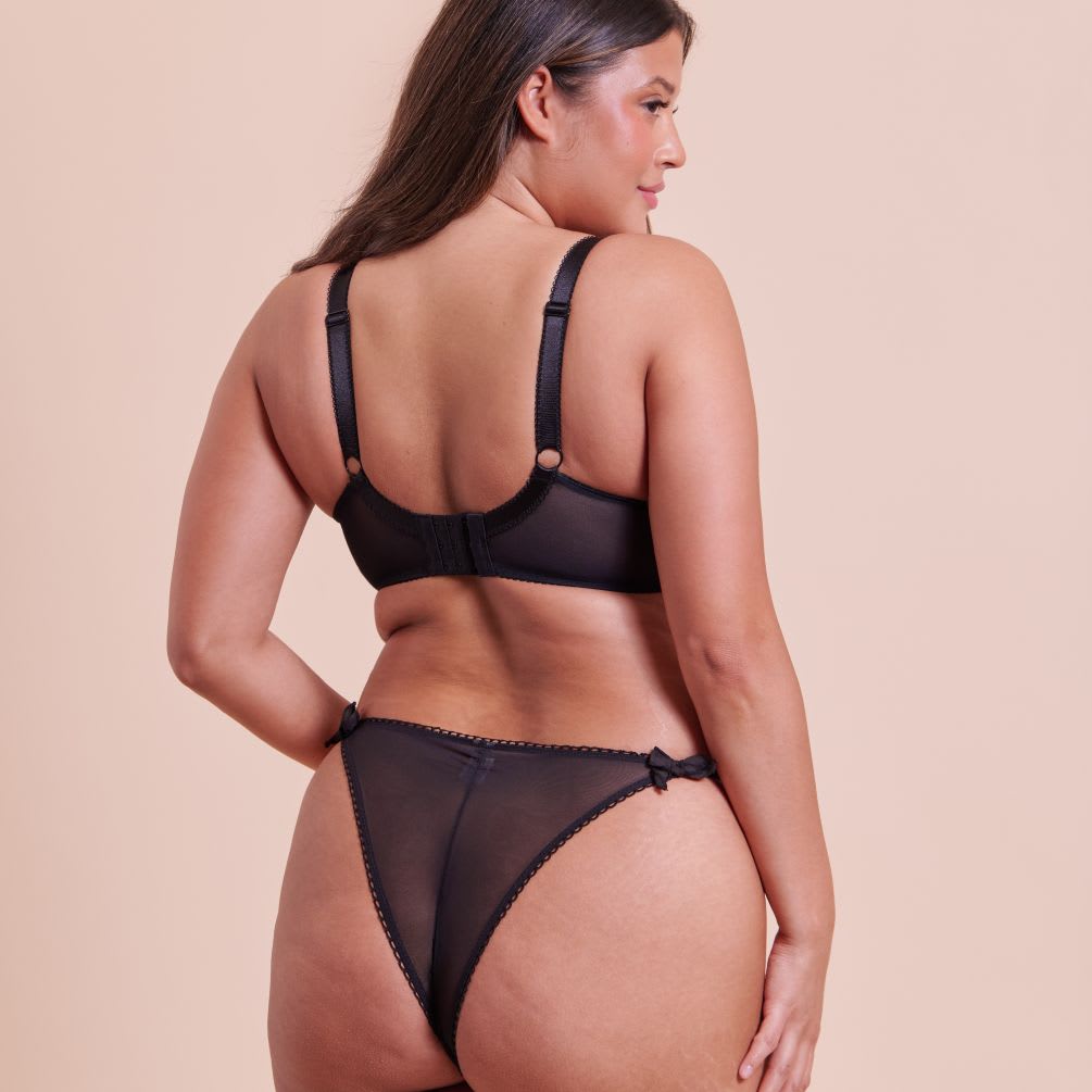 Delicate floral broderie anglaise-look material with matching trim, making this a super feminine and on-trend set. Tanga brief.