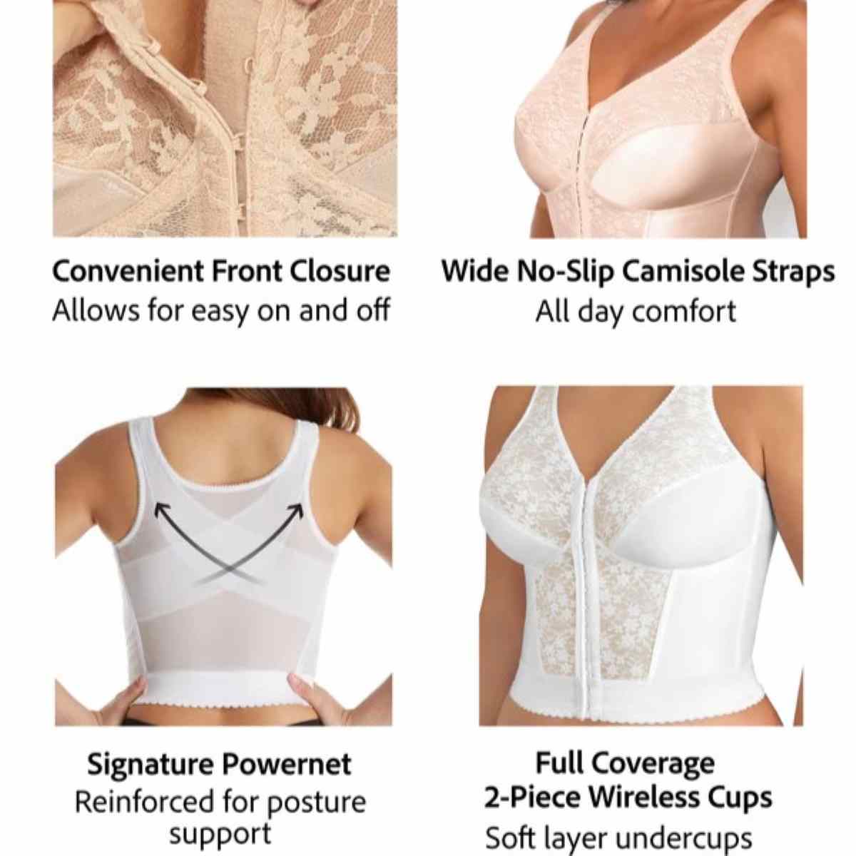 Front Close With Lace Longline Posture Bra is a front opening longline bra with wireless 2-part cups for shaping and comfort.