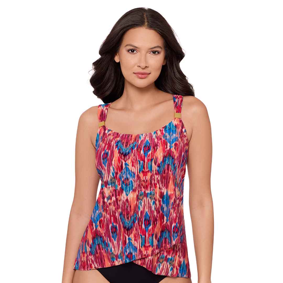 The floaty Ikat Dorado Dazzle Underwired Draped Tankini Top (best suited to A–D cups) features a double-layered, loose-fit design for full tummy coverage, an Ikat textile-inspired print flecked with gold shimmer, a flattering scoop neckline, wide adjustable shoulder straps with jewellery detailing, and a draped front to smooth and shape your silhouette.
