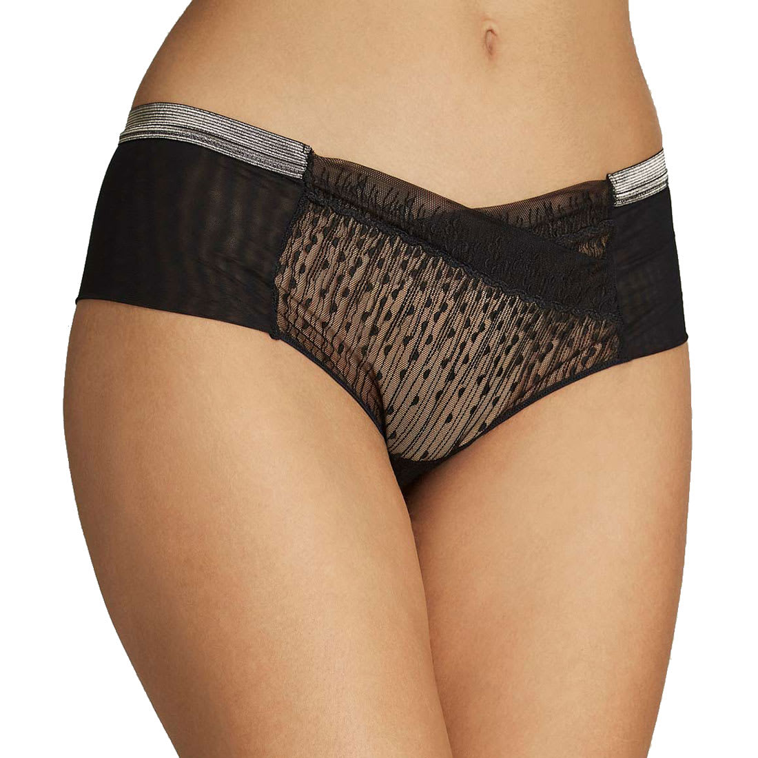 The silver band at the waist installs a subtle touch of sparkle.This short seduces with its comfortable waistband and embroidery inserts with contemporary and romantic influences.Front lace design for opacity and discretion.Flat seams finish to be discreet under clothing.A must have in your Lingerie drawer.