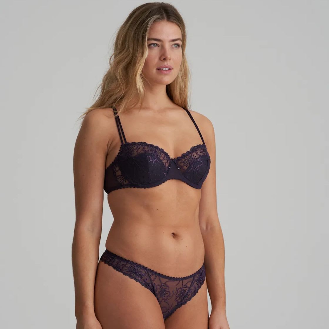 Elevate your lingerie collection with this chic and luxurious balcony bra from Marie Jo's Jane range, featuring exquisite embroidery. The padded cups have soft foam at the bottom for added support, while the high-gloss embroidery on the top and lace border along the neckline add a touch of sophistication. The bra also features underwiring for extra support and fine adjustable straps for a personalized fit. Complete your look by pairing it with matching coordinates from the Jane range.