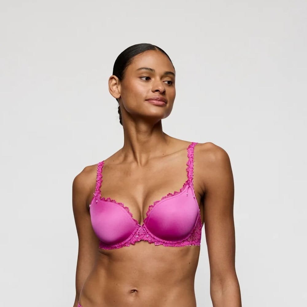 Get the confidence to wear any outfit with this Marie Jo Jane bra that will give you a smooth and flawless silhouette. The deep plunge neckline and the smooth padded cups make it perfect to wear with any low-cut or tight-fitting top. The intricate feminine embroidery on the cups and adjustable straps adds an extra touch of elegance. With underwired cups and a traditional hook and eye back closure, you can have both comfort and support. Complete the look by pairing it with other items from the Jane collection for a coordinated style.