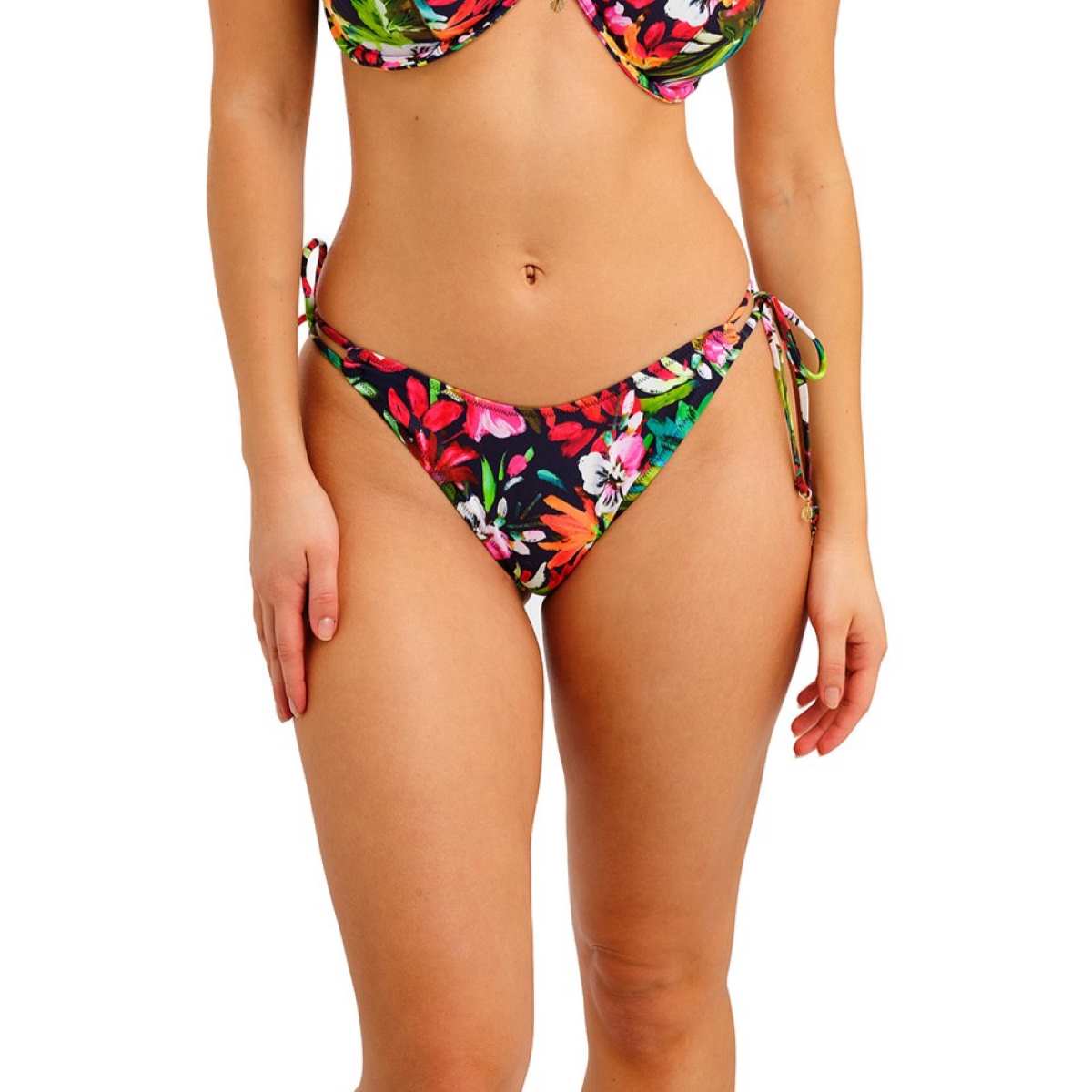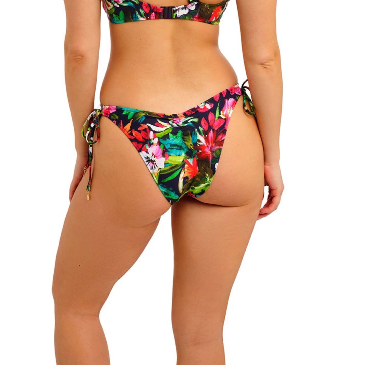 Hit the waves in style with Kailua Shores, our bold new tropical print designed to make a statement. Featuring hot pinks, fiery oranges, and lush jades against a deep navy base, with luxe gold-coloured leaf trims, this skimpy bikini brief sits high on the hips with a higher scoop leg line for reduced coverage. Finished with minimal back coverage and decorative gold-coloured leaf trims on the end ties, it’s perfect for sun-soaked beach days.
