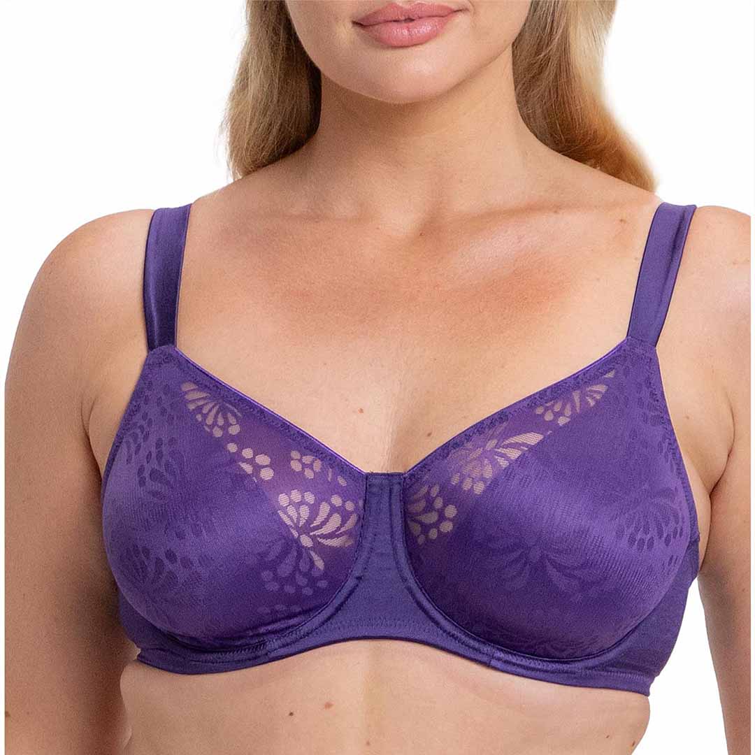 Clearance item—NON-RETURNABLE. This minimizing set refines the appearance of your curves in a delicate and sexy elastic lace-covered fabric. Designed with larger cup sizes in mind, the bra can visually reduce your bust by up to one cup size.The cups are partially lined for support with a semi sheer panel at the top cup softening the look and visually reducing the size of the bra. Soft feel straps and hook & eye provide wearer comfort.