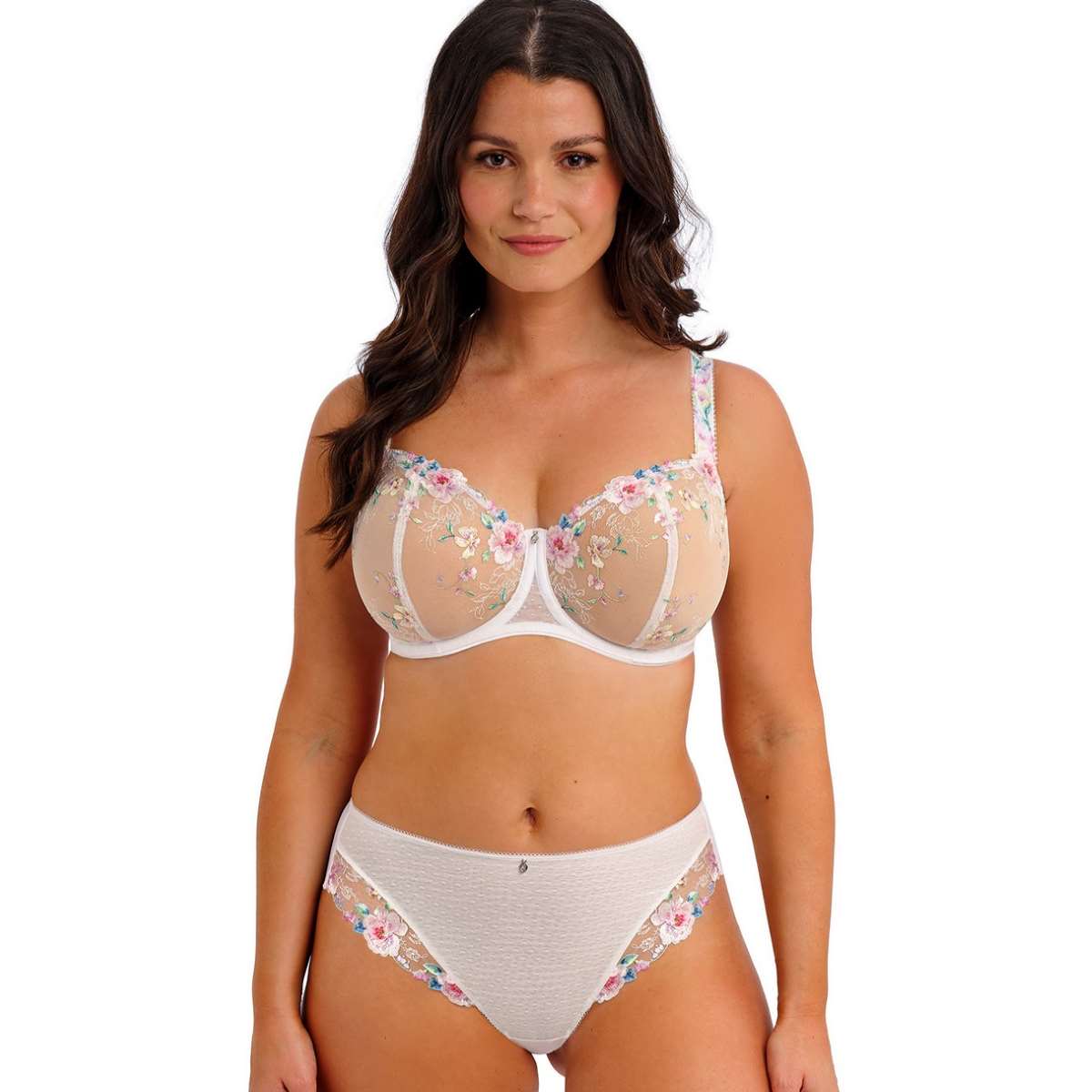 The Lillia bra celebrates summer with delicate embroidery in soft pastels on a crisp white base, combining feminine design with Fantasie’s signature fit. Wide wired cups and an inner side sling offer support and uplift, while powernet wings provide anchorage. Fully adjustable shoulder straps and a metallic charm with gem at the centre front complete this elegant, comfortable design.