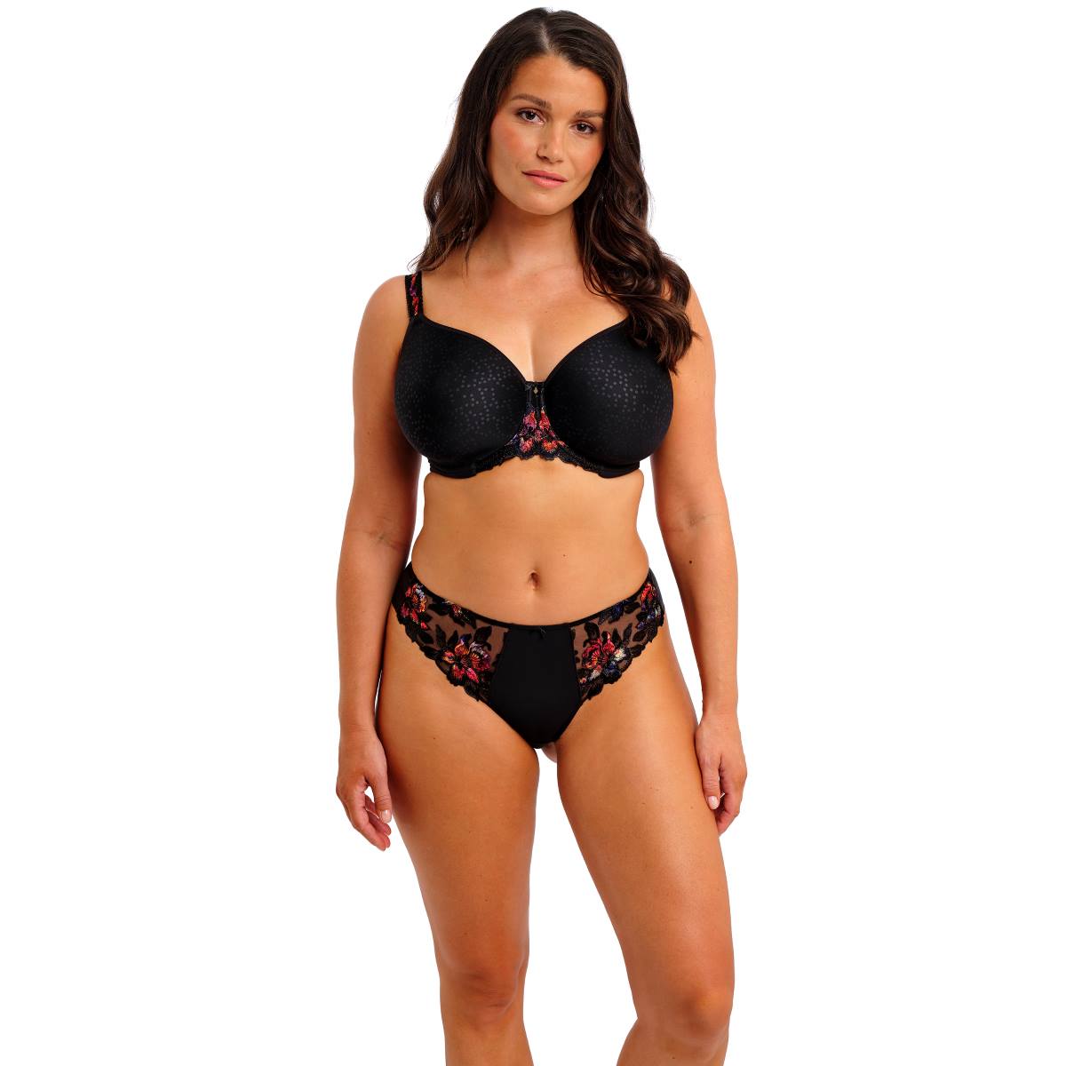 Introducing Magdalena, our standout collection where luxury meets comfort. Featuring intricate, heavily stitched embroidery in vibrant sunset hues over a striking black base, this range exudes elegance and sophistication. Based on the beloved Rebecca FL2024, this style is wide wired for additional comfort and support, with a spacer mould that offers a beautifully rounded shape and full breast coverage without adding volume. The geometric embossed design on the spacer cup adds a contemporary touch, while flexibility at the neck edge and underarm ensures an effortless fit. Crafted from lightweight, breathable spacer fabric, the cup is seam-free for a smooth, invisible silhouette under clothing. The design is elevated with luxurious multi-tonal embroidery and lurex detailing through the cradle, complemented by embroidered front straps and centre pull straps with tow back for added support and to prevent slippage. Available up to an H cup, it’s finished with fully adjustable soft peach skin shoulder straps and a delicate bow with a metallic charm at the centre front. We recommend hand wash only.