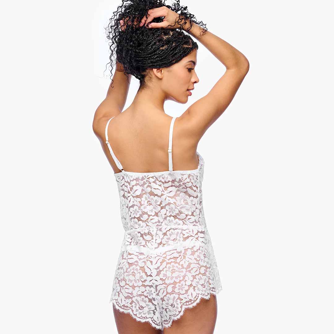 Indulge in luxury with this semi-sheer lace Magnolia Romper crafted from romantic, scalloped, floral eyelash lace and finished with elegant satin trim. The sweetheart neckline features delicate pearl buttons and a satin accent at the front, adding a touch of vintage charm. Designed in a short, cheeky fit with moderate rear coverage, it offers a flattering, feminine silhouette. Complete with adjustable satin straps for a perfect fit. Care: Hand wash only. Do not tumble dry.
