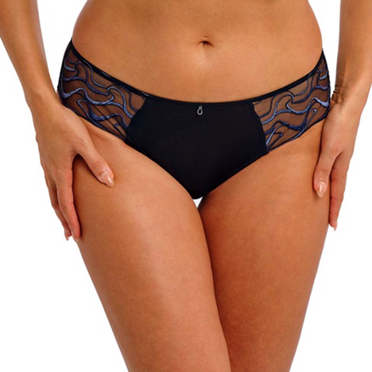 The Mayumi Brief offers a comfortable fit with a mid-rise waist and medium back coverage. The side front panels feature multi-tonal blue geometric embroidery on a black tulle net base. A lined stretch mesh front panel provides modesty, while a two-ply stretch mesh back, on the fold, sits flat against the body to avoid a visible pant line. Plain plush elastics at the waist and front leg ensure a tailored finish, and a contemporary charm detail at the center front completes the look.