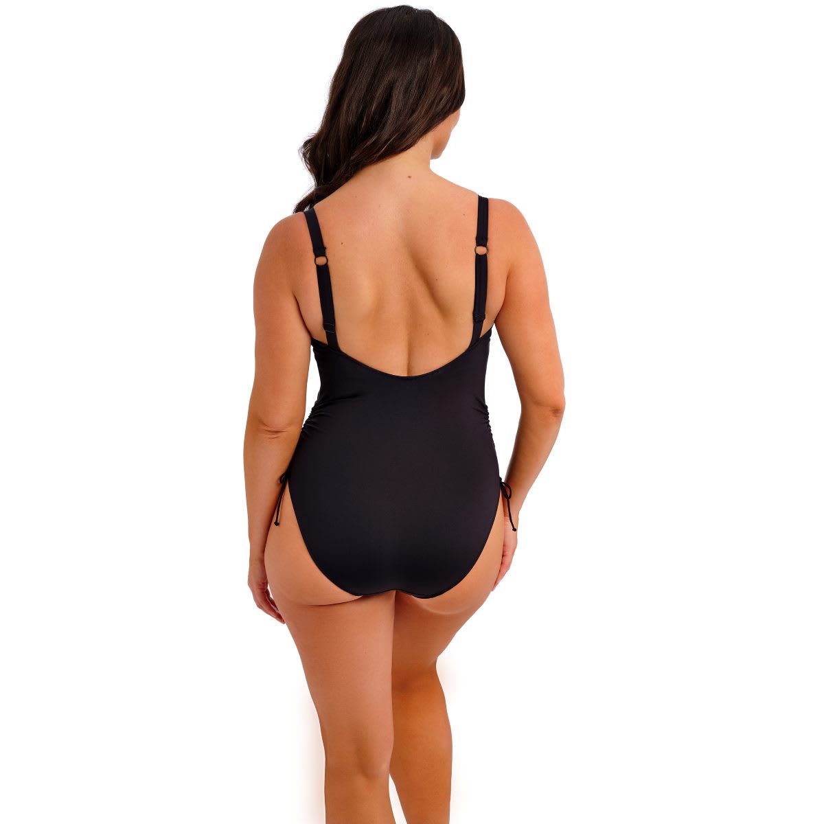 The Merissa Black Swimsuit is a holiday essential, made from sustainable ECONYL® regenerated nylon. It features a supportive inner cup, soft elastic underband, and adjustable tie sides for a flattering fit. With a lower scoop back, fully adjustable straps, and metallic gold centre-front trim, this stylish swimsuit combines comfort, support, and effortless sophistication for any getaway.