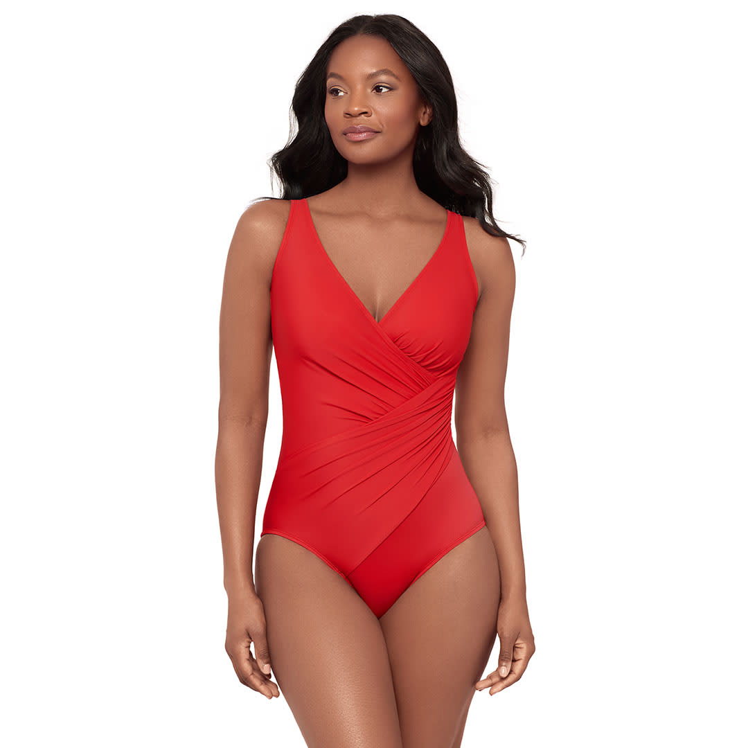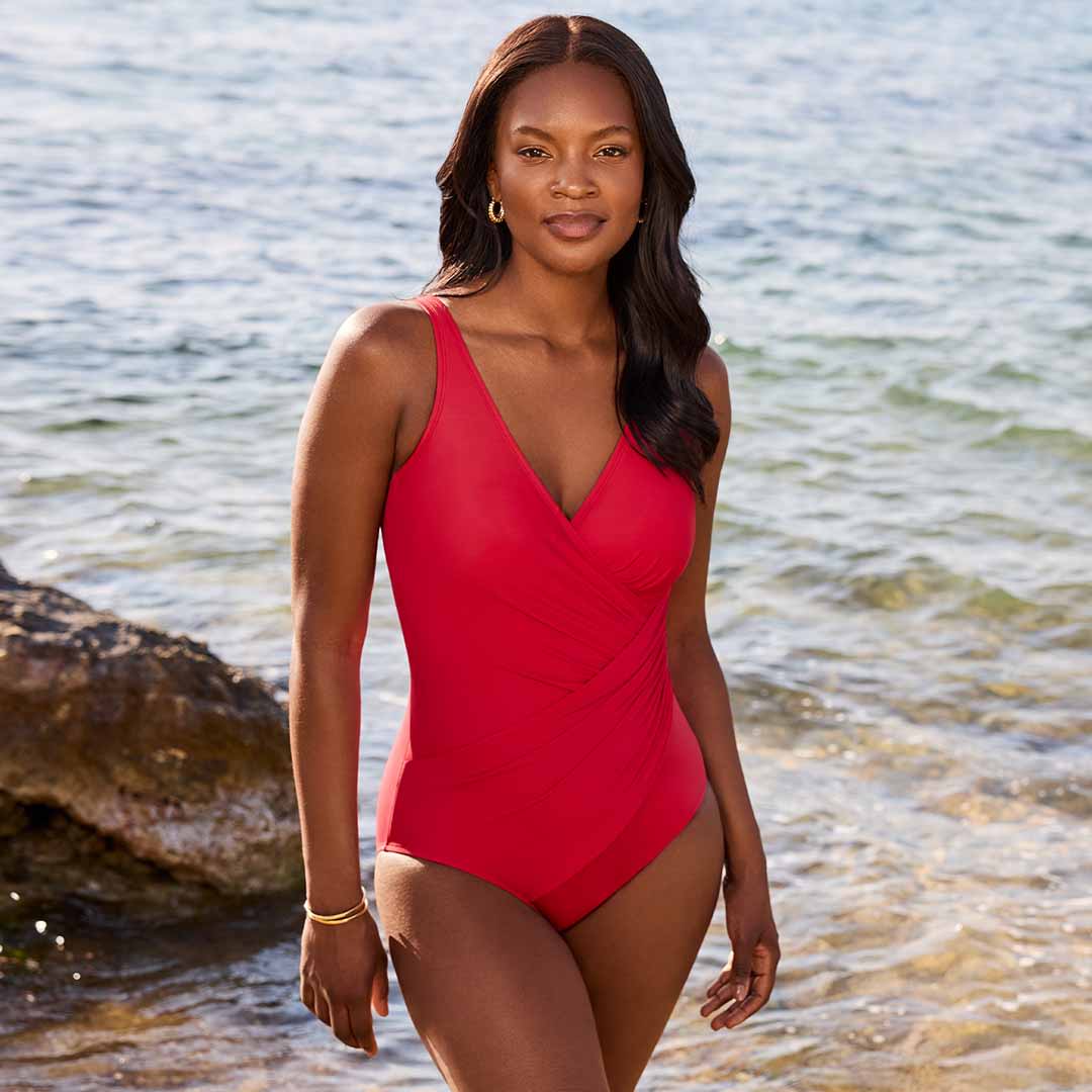 This classic, one-piece Must Haves Oceanus Shaping Swimsuit with a crossover neckline is the perfect way to create a more hourglass-y silhouette. The wrap-over front leads to a subtle gathering at the side to emphasize your waistline, and this shaping swimsuit provides all-over smoothing and slimming thanks to Miraclesuit's lightweight-yet-powerful Miratex control fabric.