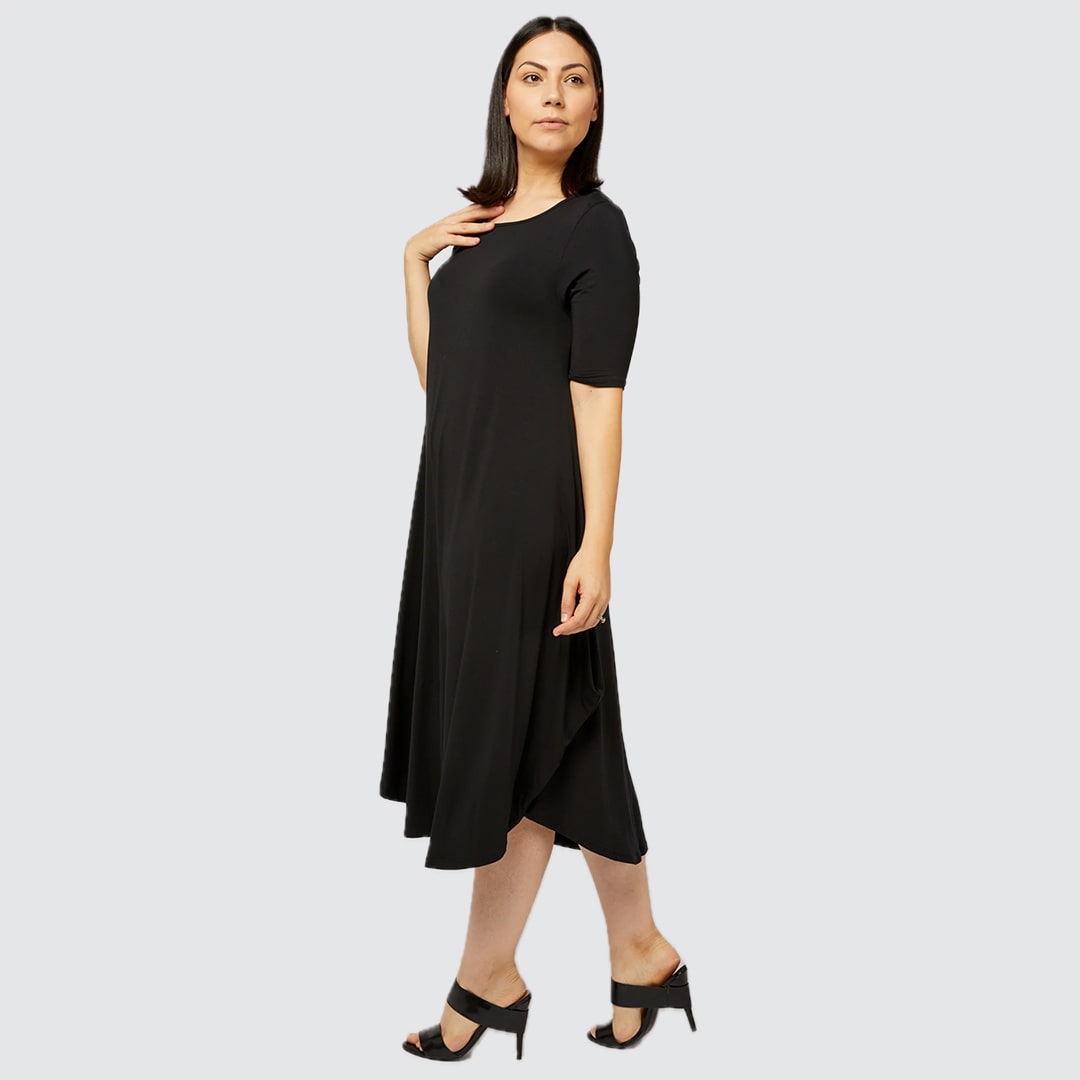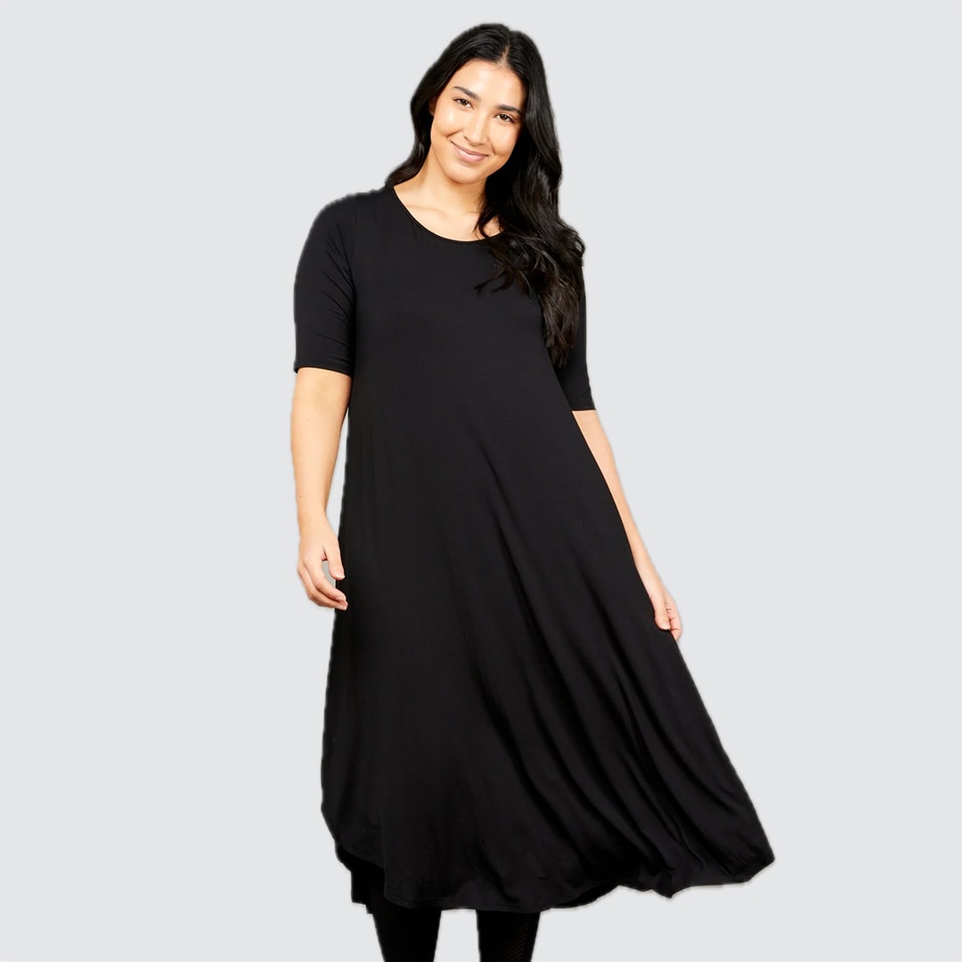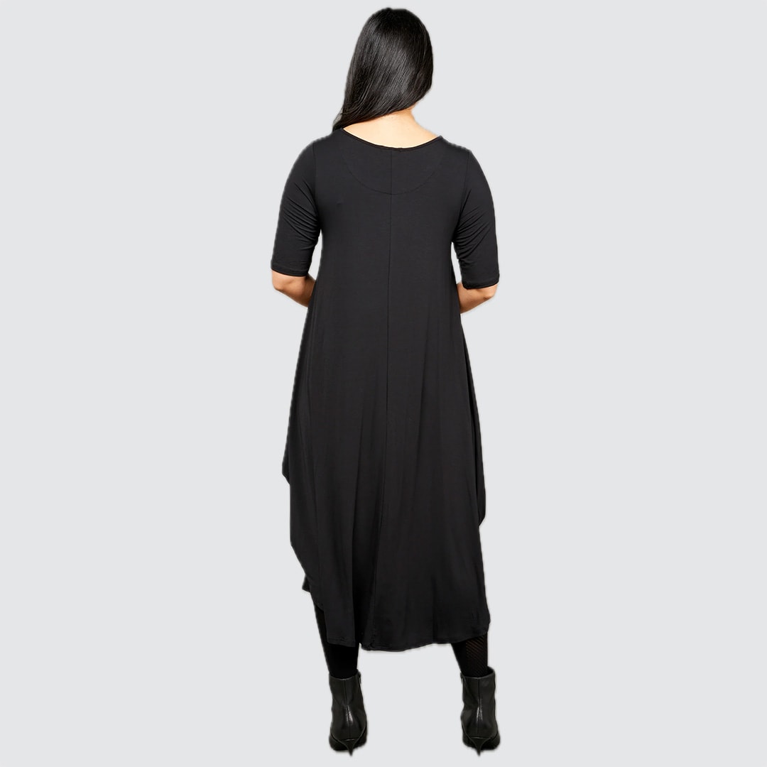 Designed with generous sizing (size down for a less voluminous fit), this below-the-knee dress features a soft drape that moves beautifully. Its universally flattering silhouette suits every body shape, allowing you to wear it loose for ease or belted to define the waist. The Original Deep Sea Floral Tri Dress is a true customer favourite, available in the black and floral print.