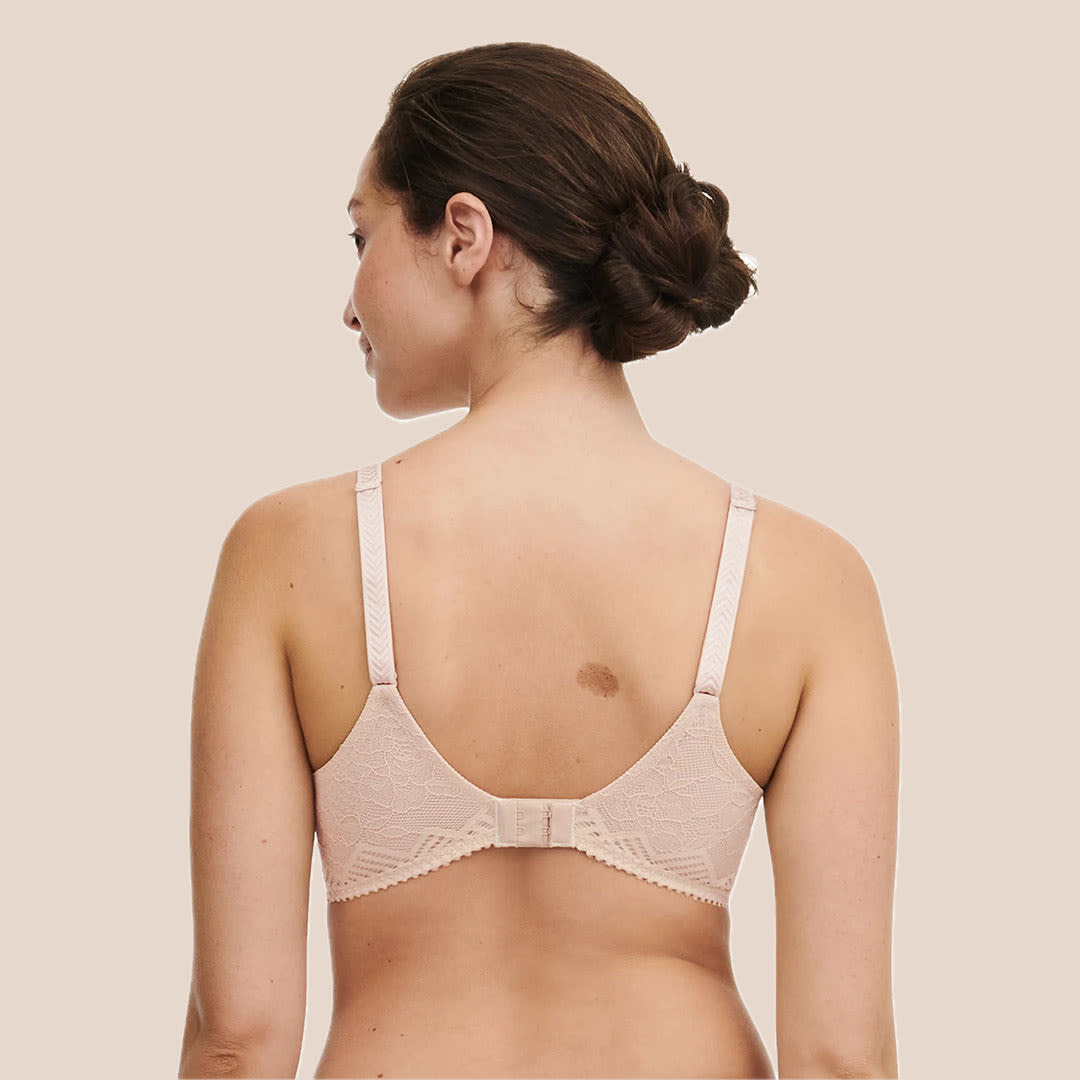 Floral lace with chevron detailing, the Origins Covering T-shirt Bra offers full support with a flattering neckline, adjustable straps, a C-branded jewel, and a tall chimney back lined in elastic tulle for all-day comfort.