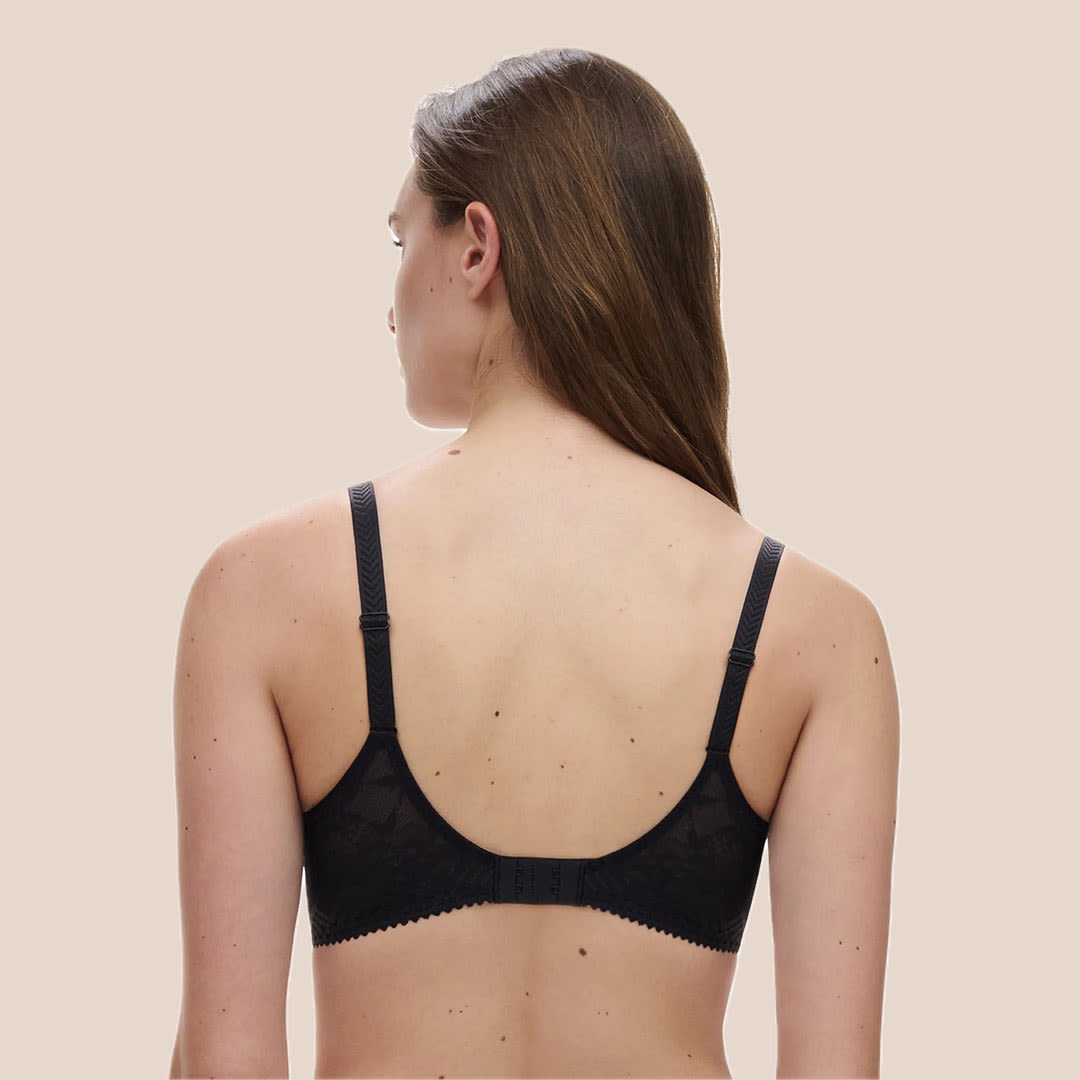 Floral lace with chevron detailing, the Origins Covering T-shirt Bra offers full support with a flattering neckline, adjustable straps, a C-branded jewel, and a tall chimney back lined in elastic tulle for all-day comfort.