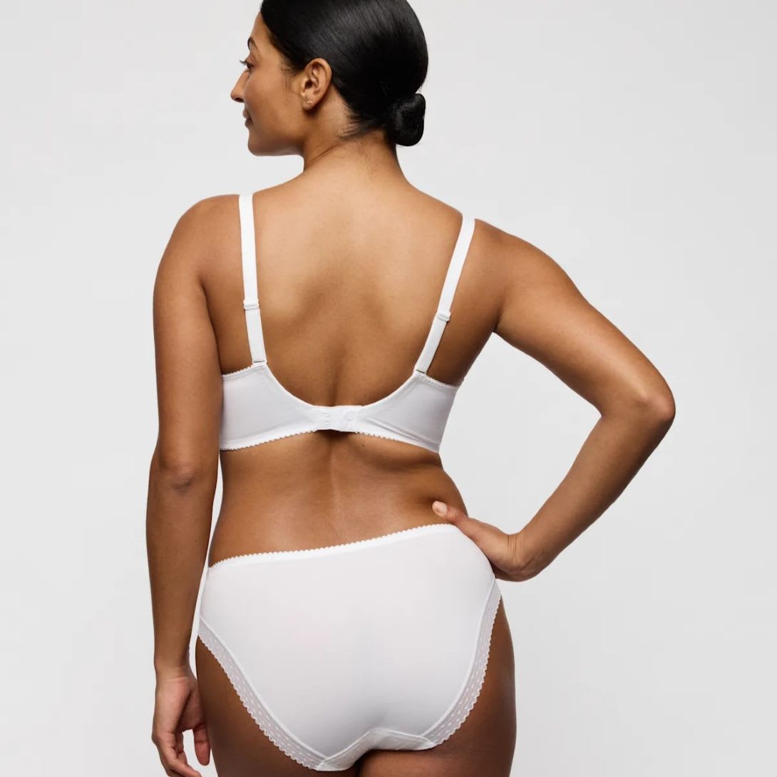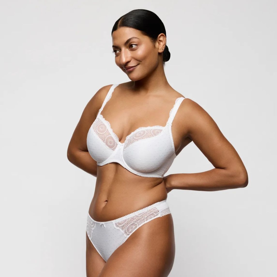Feathery light Osino Tulip Seam Balcony Bra with delicate eyelet lace at the top of the cups and plumetis fabric with a subtle sheen at the bottom. The lace continues onto the straps, beautifully framing your cleavage. Ultra-feminine and sophisticated