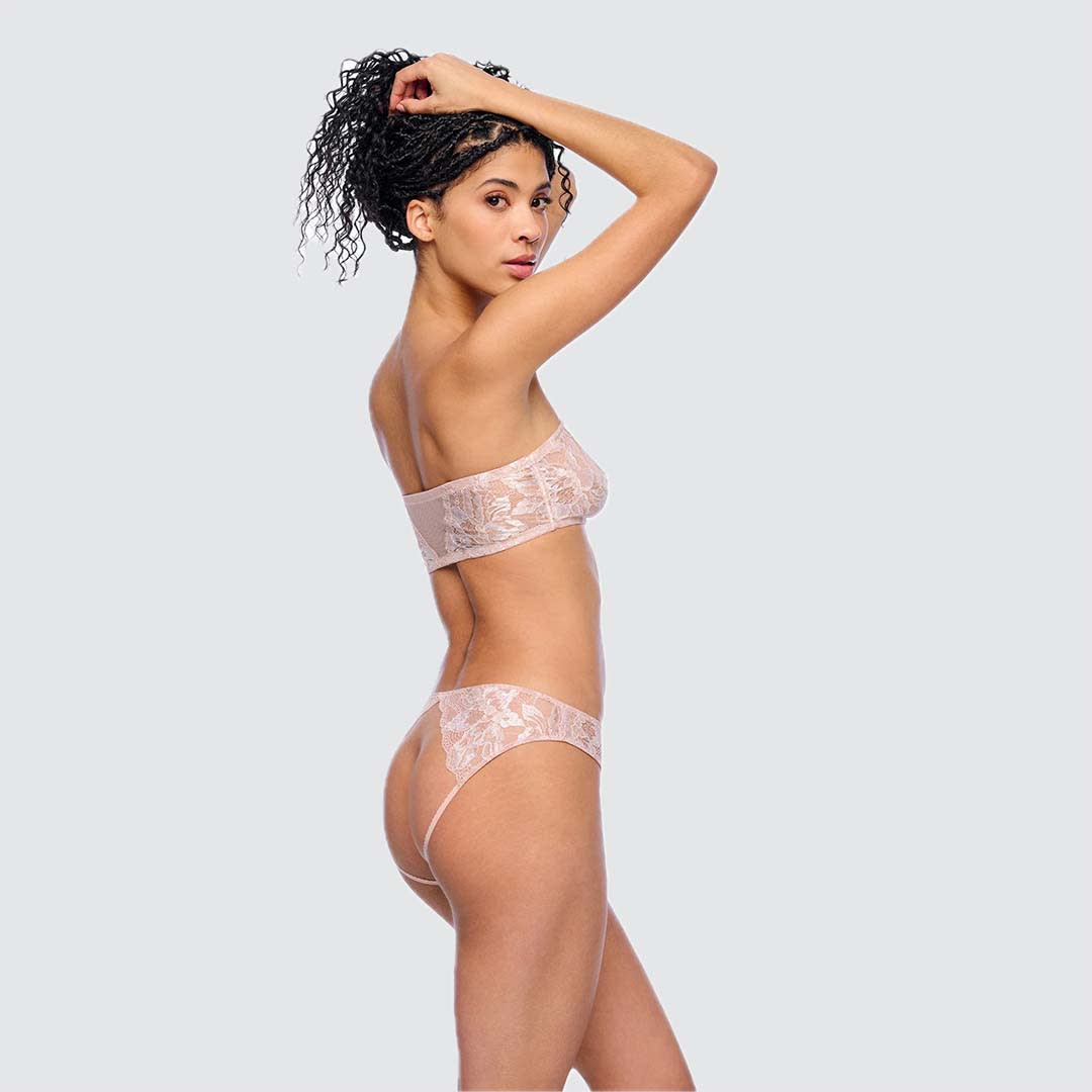 This wireless Paradiso Bandeau Bra is designed as a chic fashion layering piece, featuring a transparent plunge front for a modern, feminine touch. Crafted from semi-sheer tricolor lace with a delicate scalloped edge, it offers a beautifully detailed finish. The non-padded cups are lined at the front with power mesh to provide gentle support and subtle coverage. Designed in a convenient pull-on style with adjustable, removable straps, it offers versatile styling options. Silicone grips along the top and bottom help prevent slipping, while side boning ensures added support and structure. Hand wash only; do not dry in the dryer to preserve its delicate lace and fit.