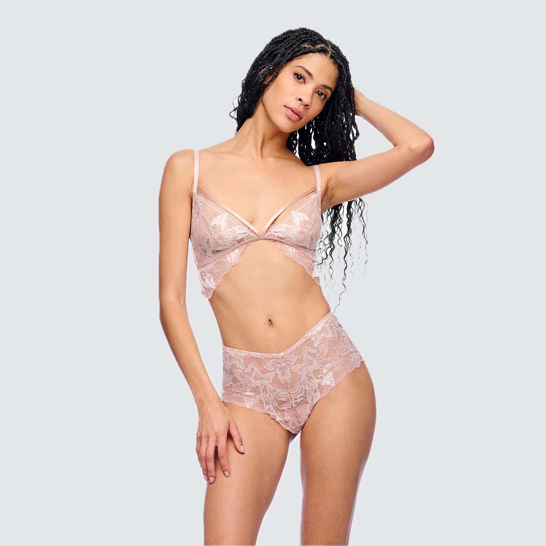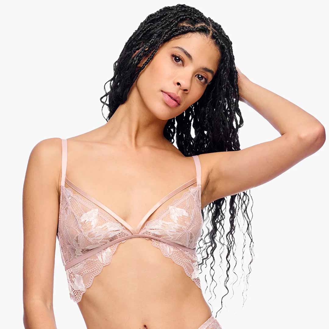 This wireless Paradiso triangle bralette is designed as a chic fashion layering piece, combining comfort with delicate style. It features semi-sheer tricolor lace with a beautifully scalloped edge, creating a soft and feminine look. The non-padded, unlined triangle cups are accented with a front strap detail that adds a modern touch. A hook-and-eye closure at the back ensures a secure fit, while adjustable straps with decorative hardware provide a customizable and elegant finish. Hand wash only; do not dry in the dryer to maintain its delicate lace and shape.