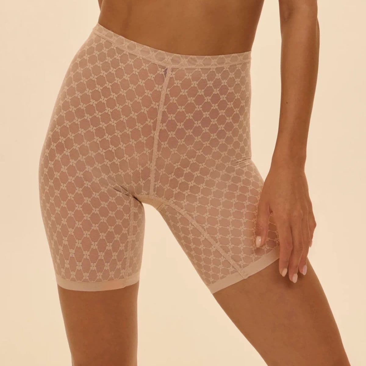 High-waisted shaping short in soft stretch tulle. Sits just under the bust for full midsection support. Mid-thigh length smooths hips and upper thighs. Lightweight and breathable shaping fabric. Flat seams for invisible wear. Stretch waistband for all-day comfort.