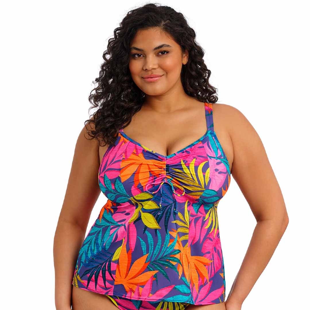 The bust area of Porto Rafti Non Wired Moulded Tankini Top is lined with a light seamless foam cup for a smooth, rounded shape and no show-through, supported by an upper back powernet lining, a centre-front drawstring for adjustable neckline coverage, a gently flared silhouette, lightweight LYCRA® XTRA LIFE™ fabric for durability, and adjustable shoulder straps for a customised fit.