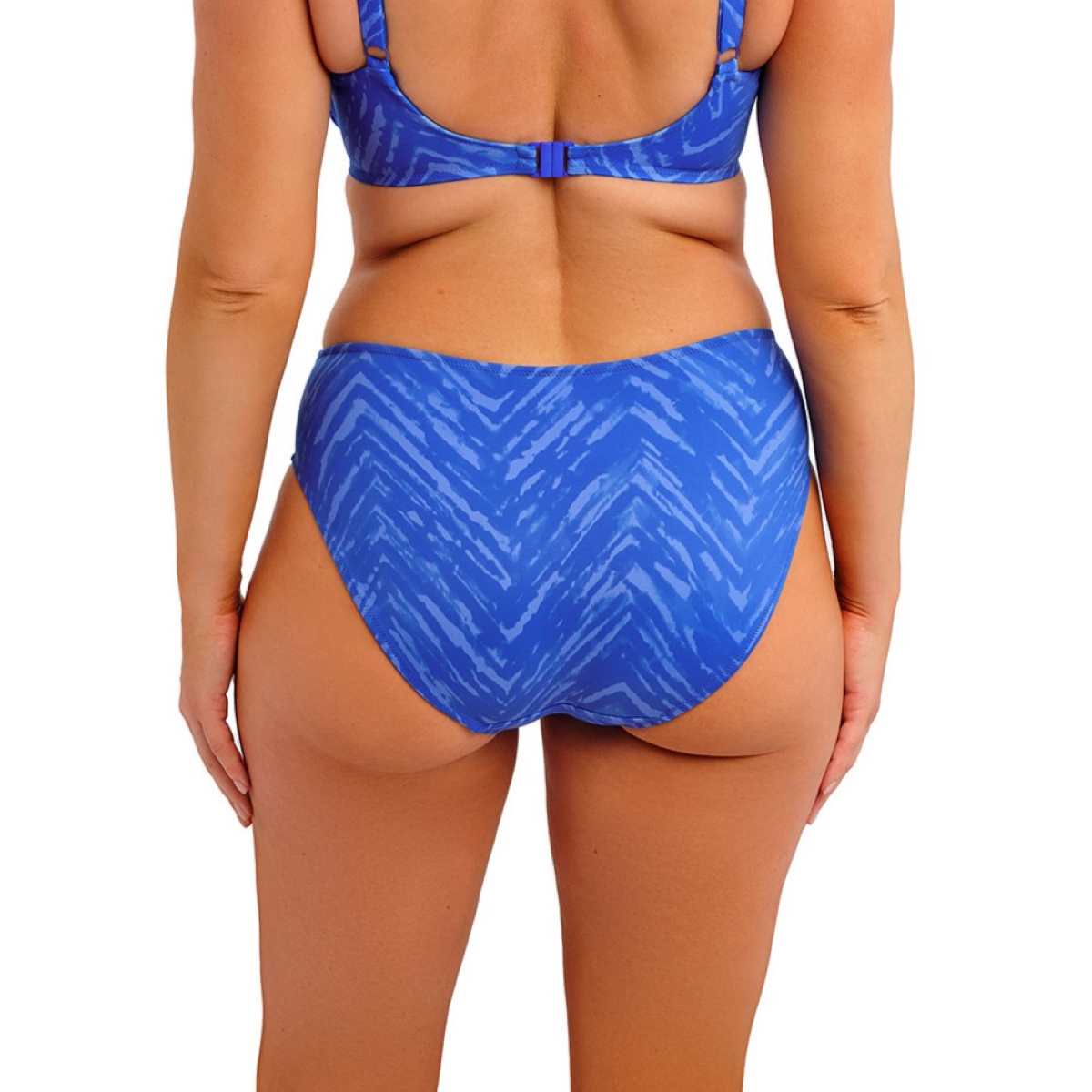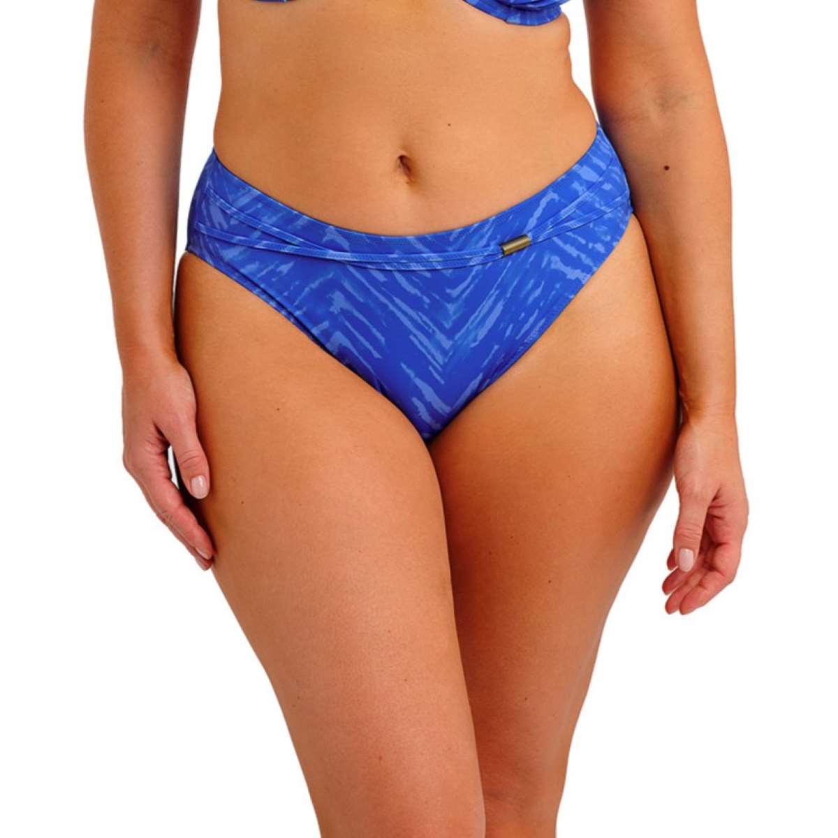 This style offers medium coverage with a fully lined finish for comfort and confidence. It features a flattering crossover belt detail, accented with front gold trim designed to stay cool in the sun.