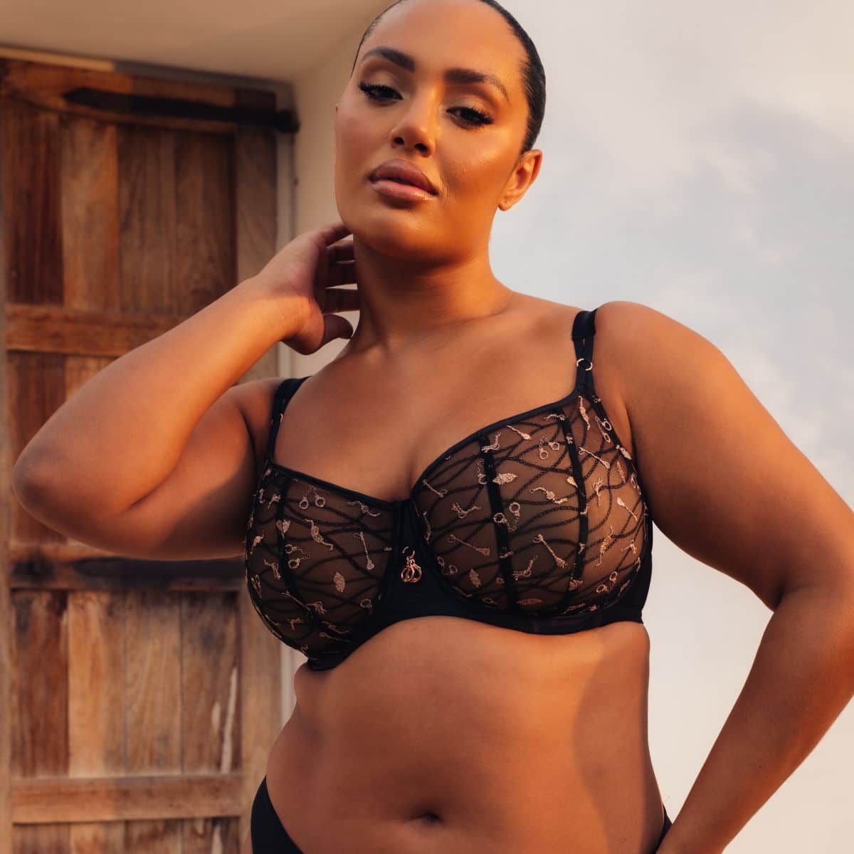 Non-padded underwired balcony bra. Embroidery detail across cups. Rose gold hardware for glamourous finish.